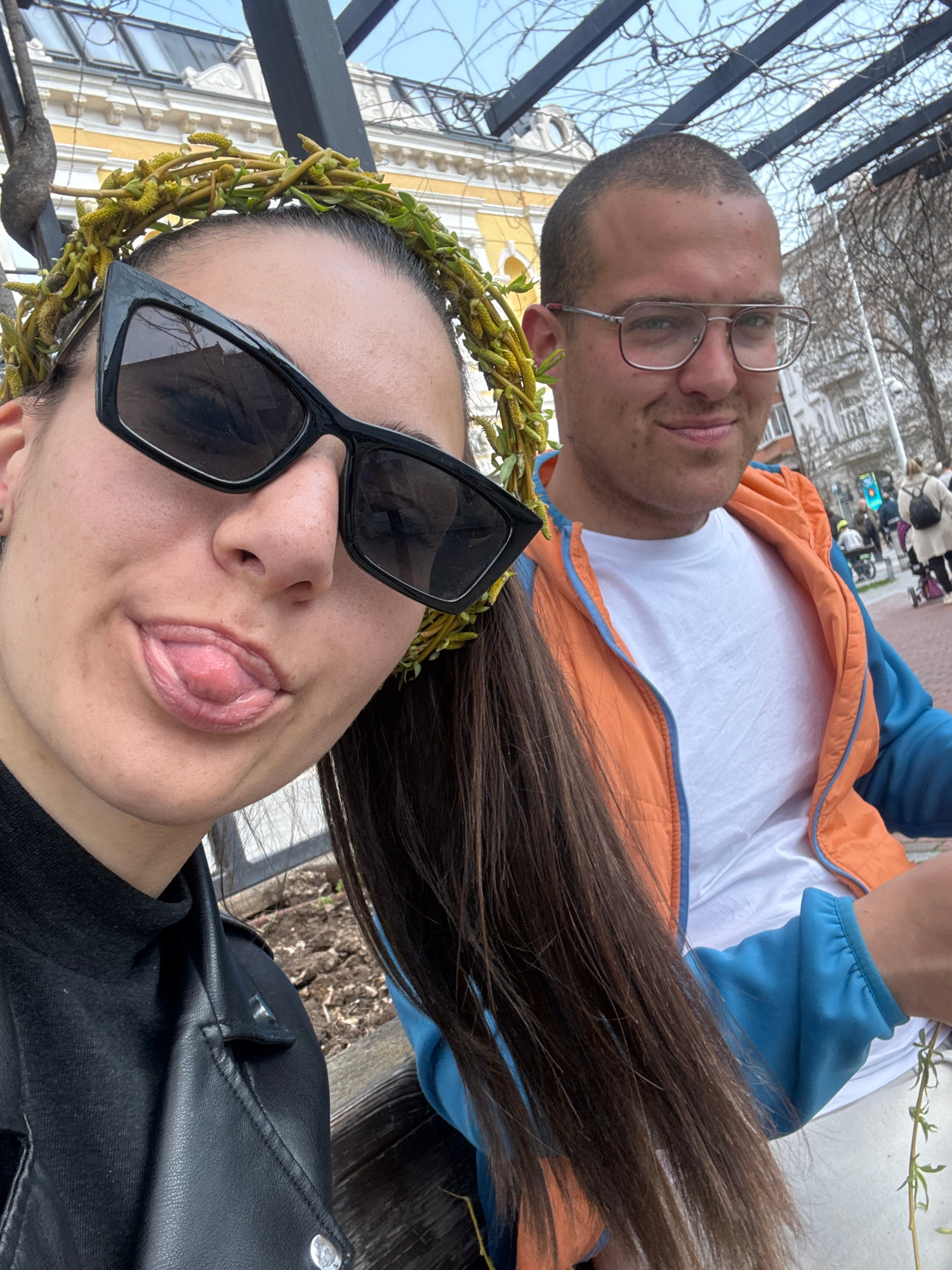 The image shows a selfie of two individuals. A woman with sunglasses and a floral head wreath is sticking out her tongue. She is wearing a black leather jacket. Behind her is a man wearing glasses and…read more