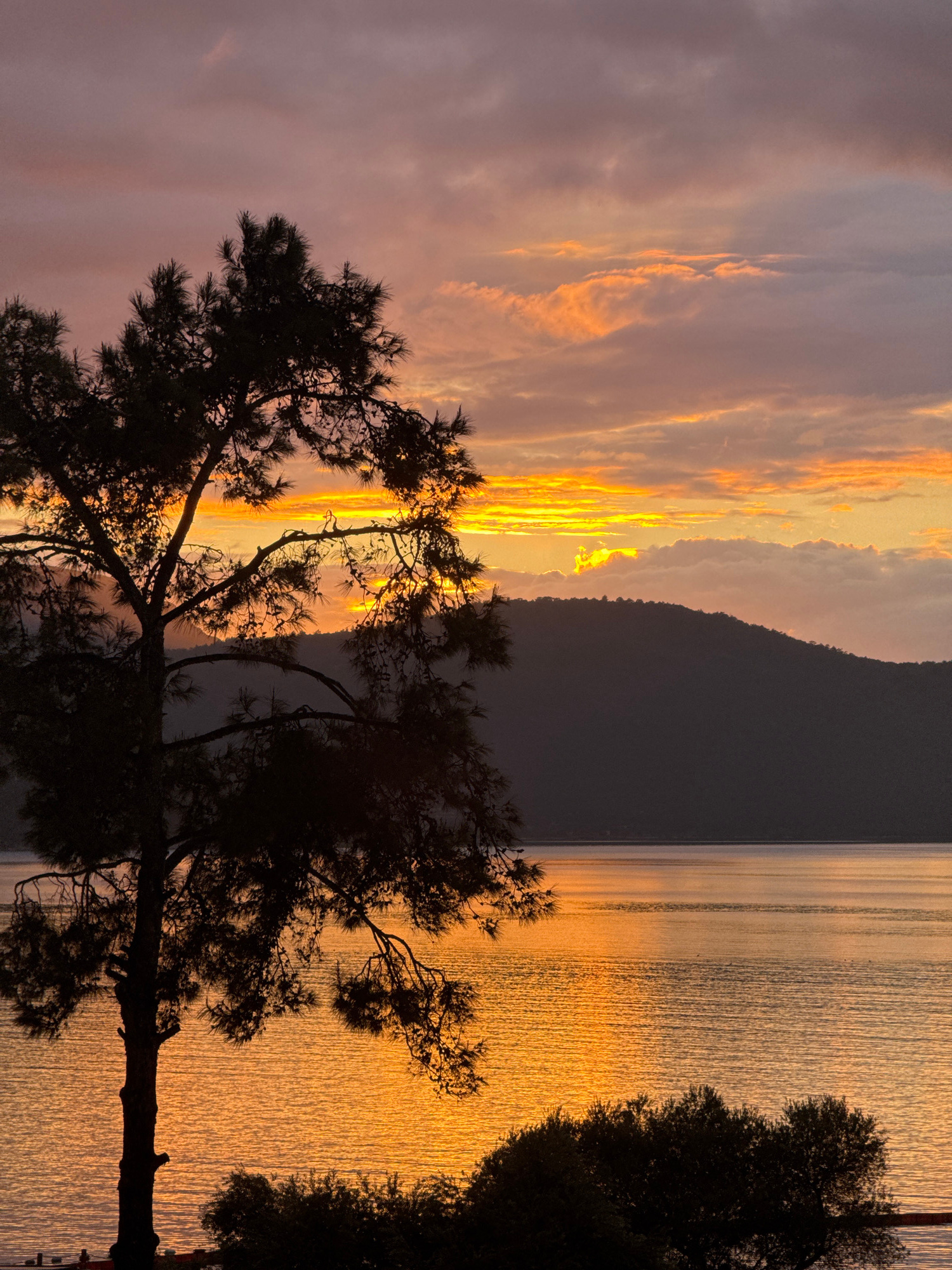 The image depicts a sunset scene, likely taken in Bodrum, Turkey, showing a body of water, possibly the Aegean Sea, reflecting the golden light of the setting sun. A dark, silhouetted mountain range s…read more