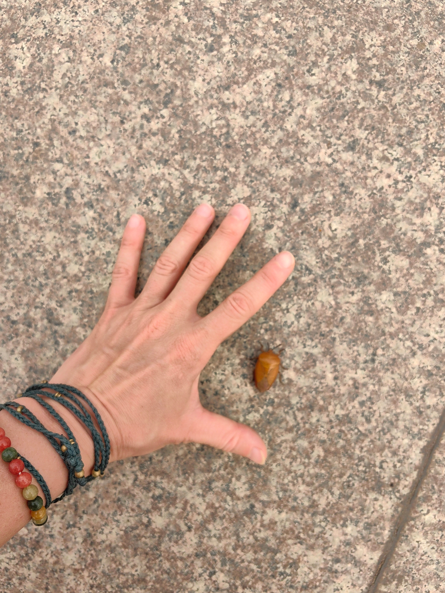 A high-angle, medium shot shows a woman’s hand and a small, brown insect on a speckled gray-brown surface. The woman’s left hand is open, with her fingers spread. She is wearing two bracelets: one of…read more