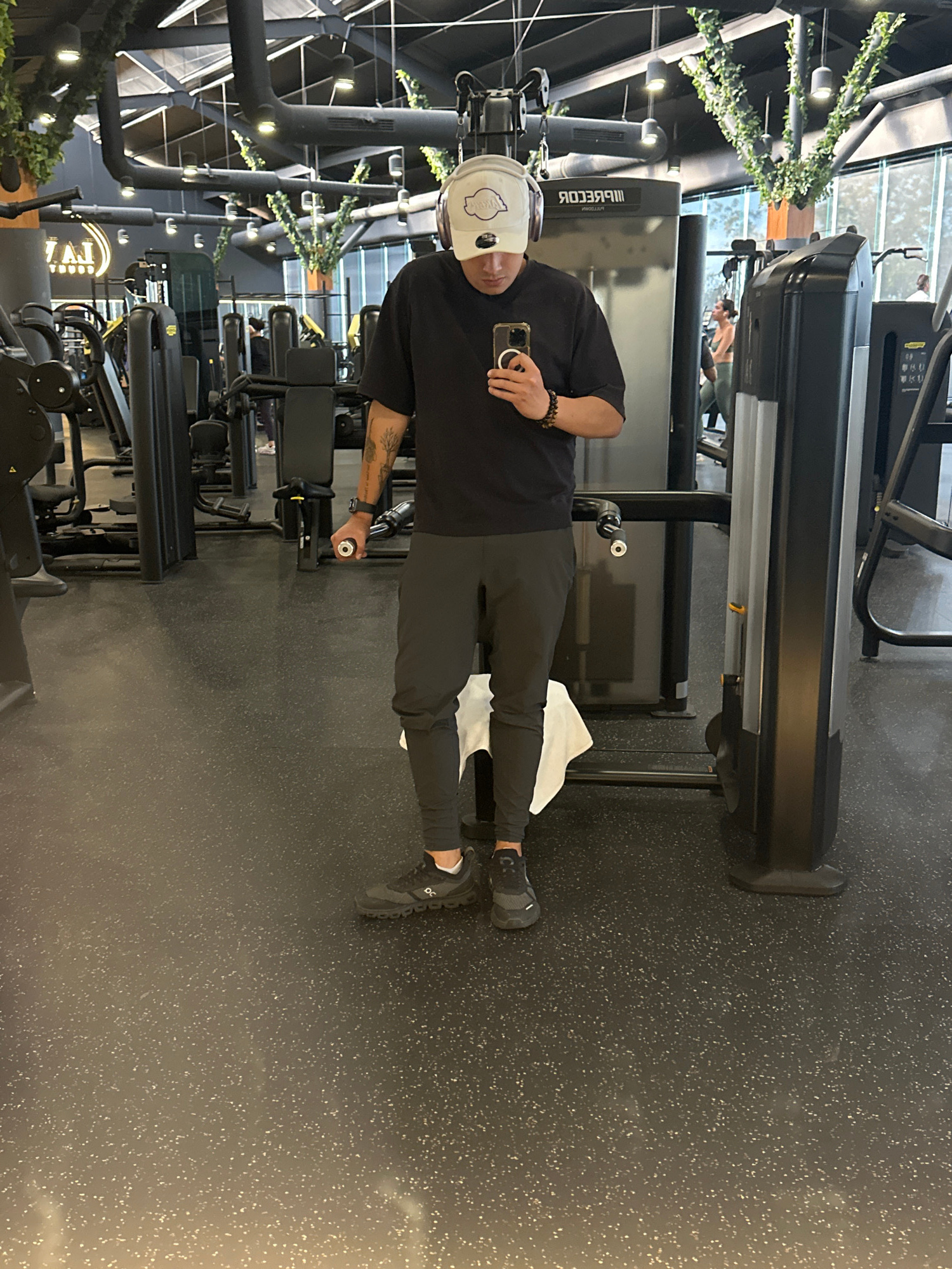 A person wearing a white hat and a black t-shirt stands in a gym. They are holding a cell phone in their right hand and grasping a weight machine handle with their left hand. They are wearing dark ath…read more