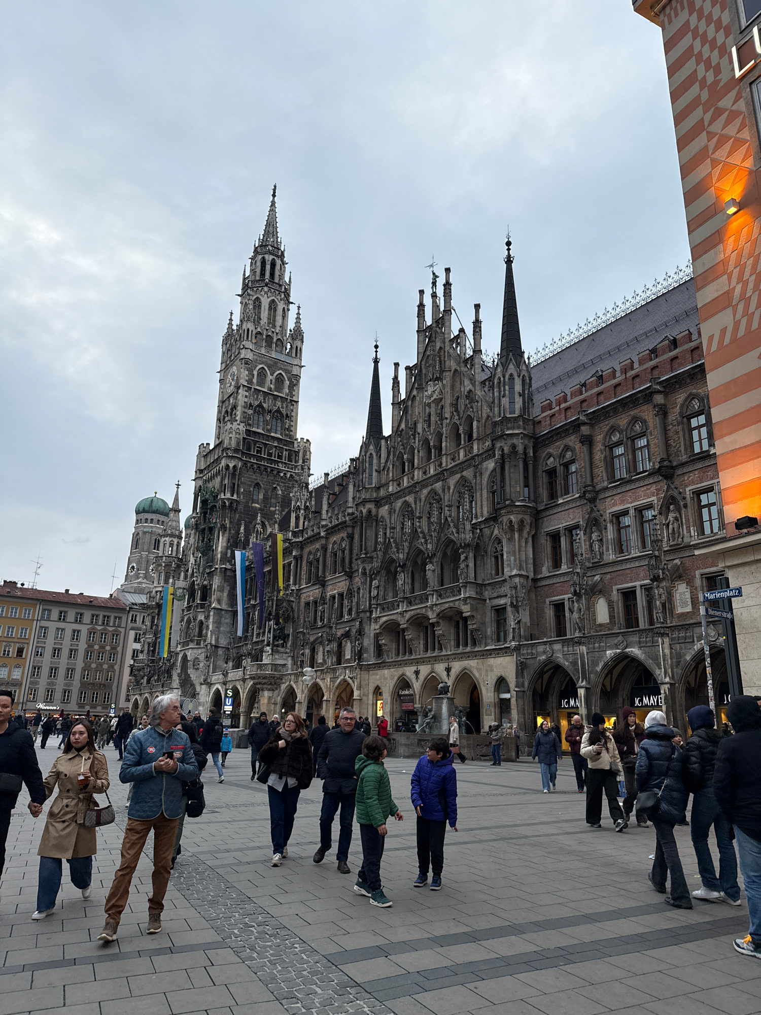 The image shows the Neues Rathaus (New Town Hall) in Munich, Germany. The building is a large, Gothic Revival structure with ornate spires and facades. The sky is overcast. People are walking on the p…read more