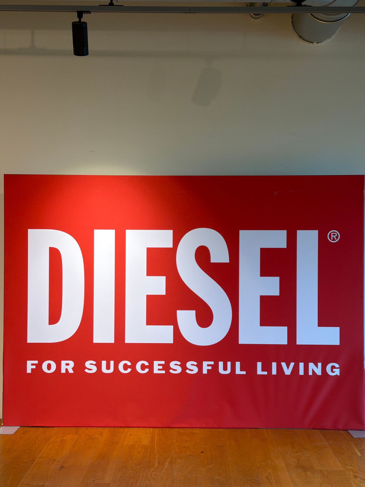 This image captures a large, vertically oriented red banner on the right side of the frame, emblazoned with the "DIESEL" brand logo. The banner features the word "DIESEL" in prominent white capital le…read more
