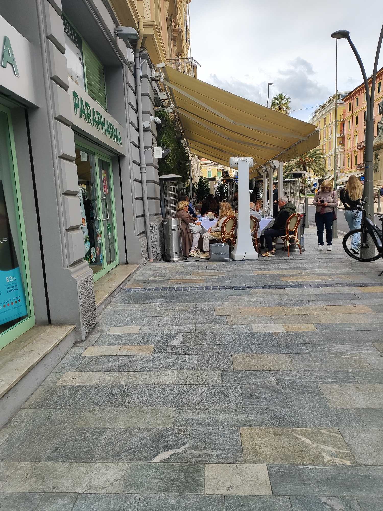 The image captures a street scene in Sanremo, Italy. A "PARAPHARMA" store with a grey facade and green trim is prominently featured on the left side of the frame. Adjacent to the store is an outdoor d…read more