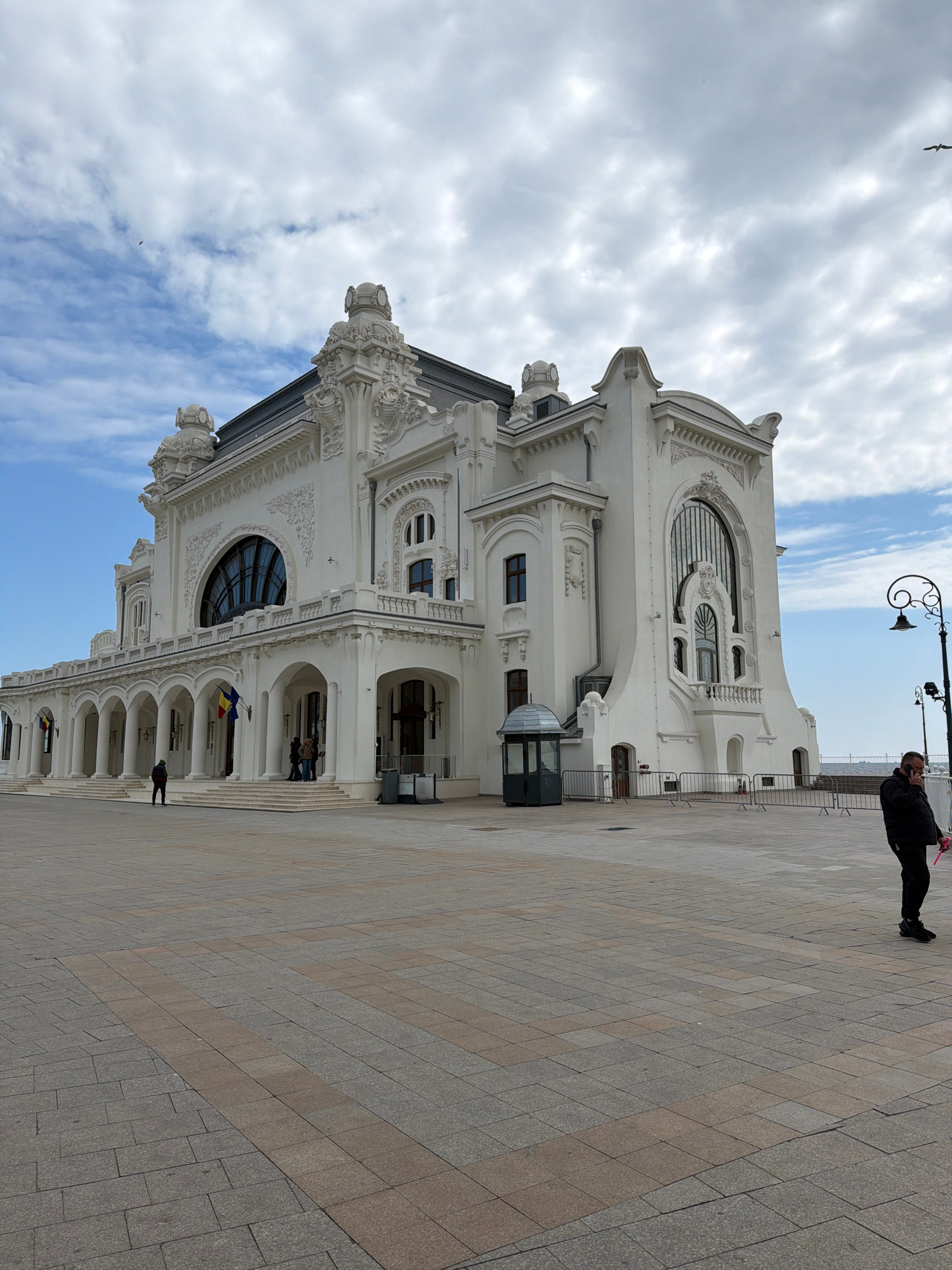 The image shows a white, ornate building with arched windows and decorative elements, located in Constanța, Romania. Several people are walking along a tiled walkway in front of the building. A lamppo…read more