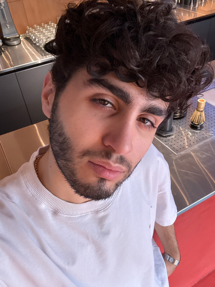 A young man with dark curly hair and a trimmed beard gazes at the camera. He wears a white sweatshirt and a gold chain. His expression is neutral, with full lips and dark eyes. The background features…read more
