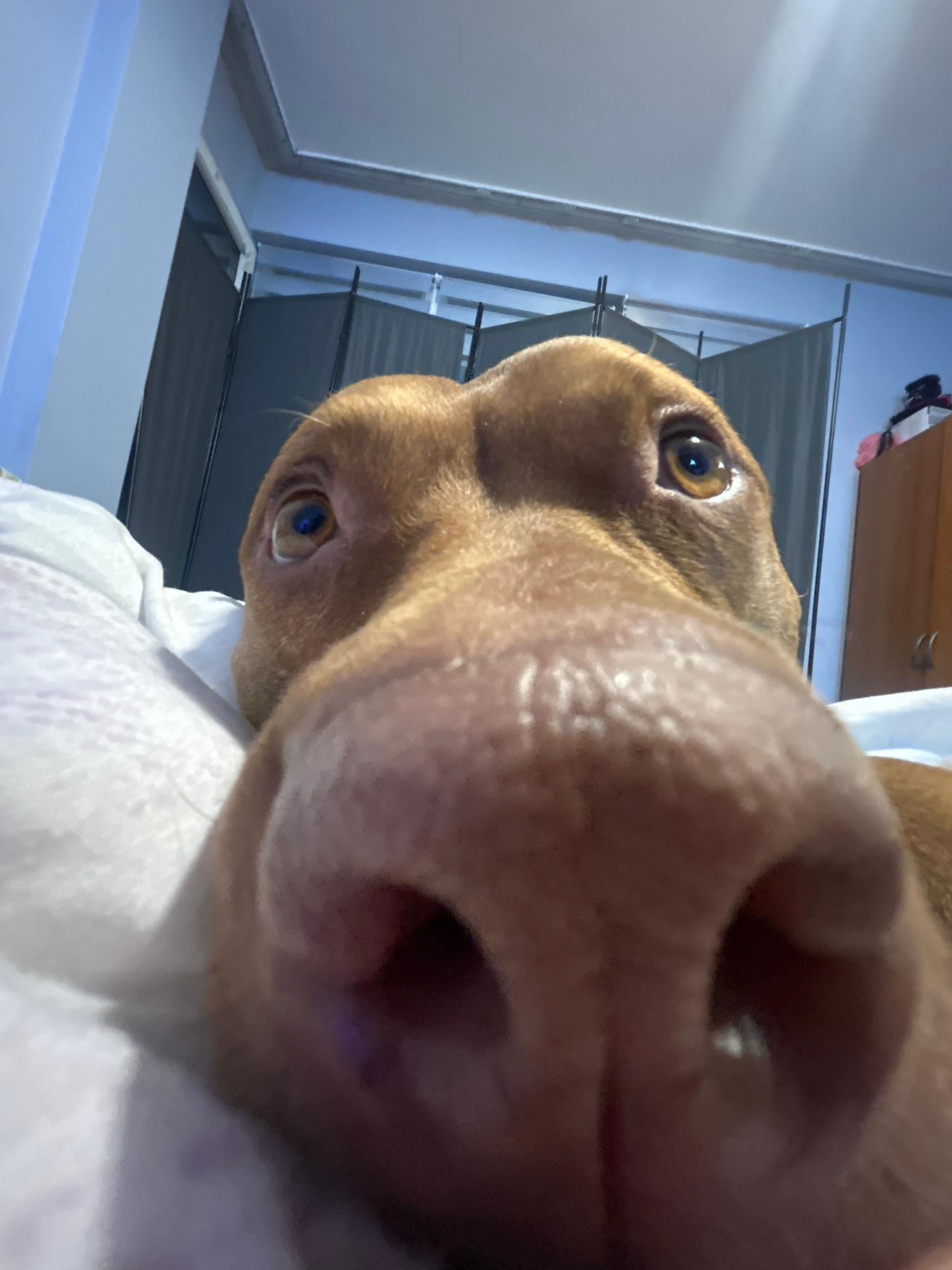A close-up photograph captures the head of a brown dog in extreme detail. The dog's large, prominent nose is centered in the foreground, with its nostrils clearly visible. Its eyes are brown and appea…read more