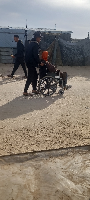 The image depicts three individuals in Khan Yunis, Palestinian Territory, against a backdrop of makeshift structures under a light sky. In the foreground, a dark-framed manual wheelchair is being push…read more