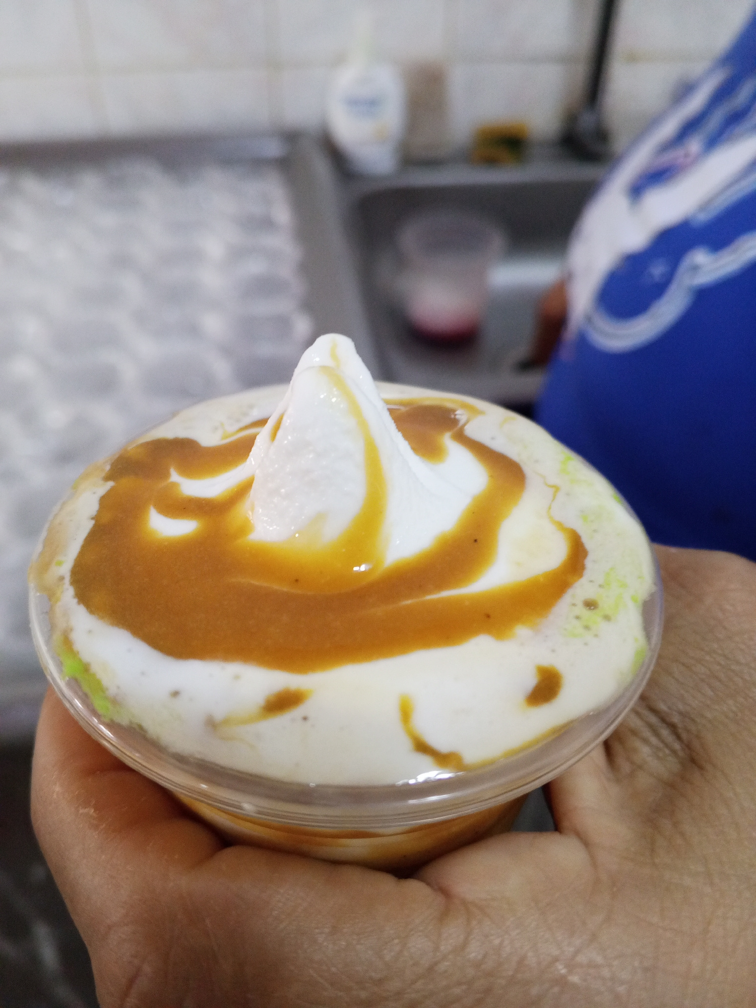 A close-up shot depicts a hand holding a clear plastic cup filled with a dessert. The dessert consists of a base layer, topped with a white creamy substance, likely soft-serve ice cream, and drizzled…read more