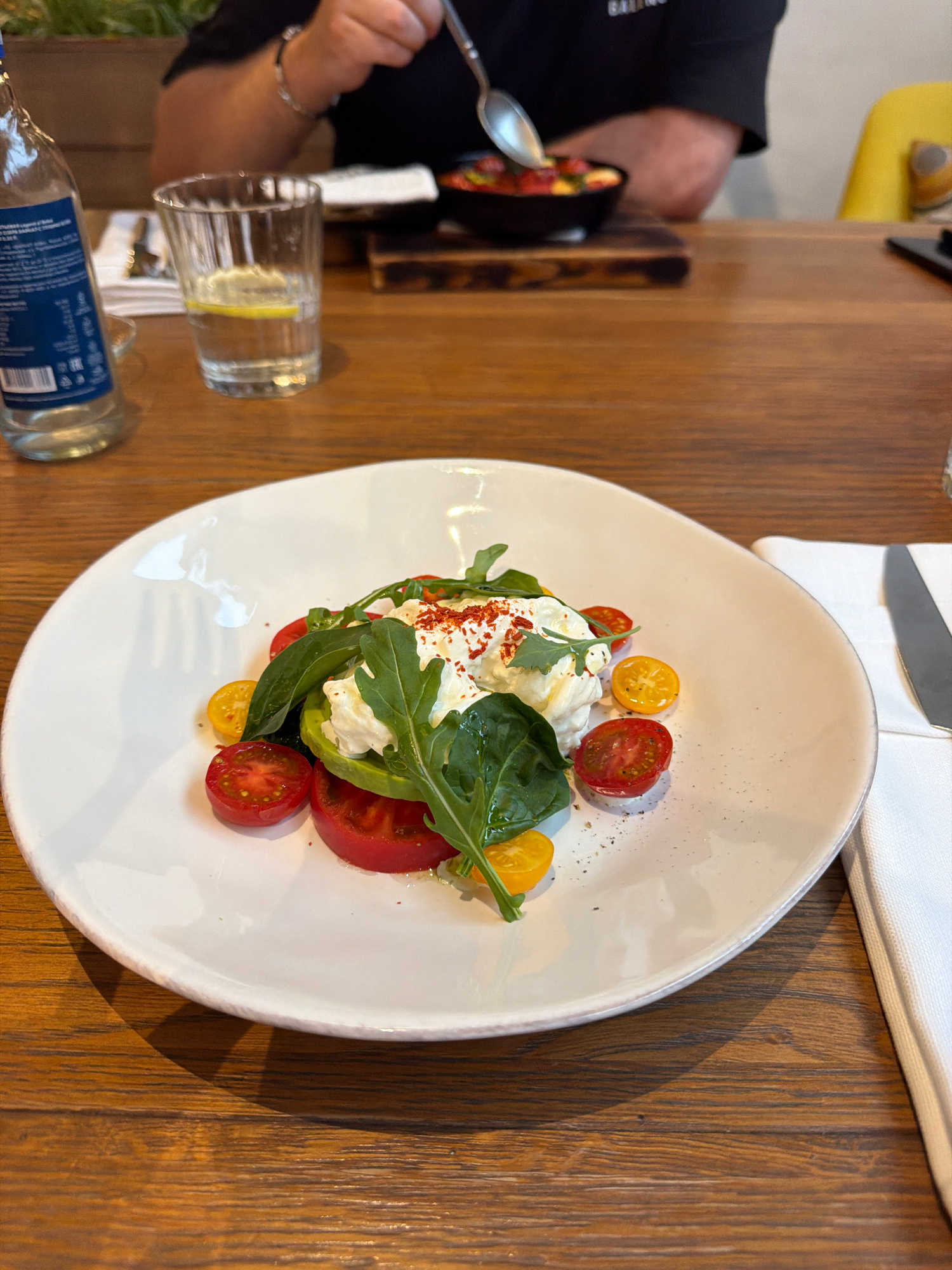 A photograph depicts a meal being eaten at a table. The table is wooden. A white plate is prominently displayed with a salad consisting of burrata, sliced tomatoes in red and yellow varieties, and greβ¦read more