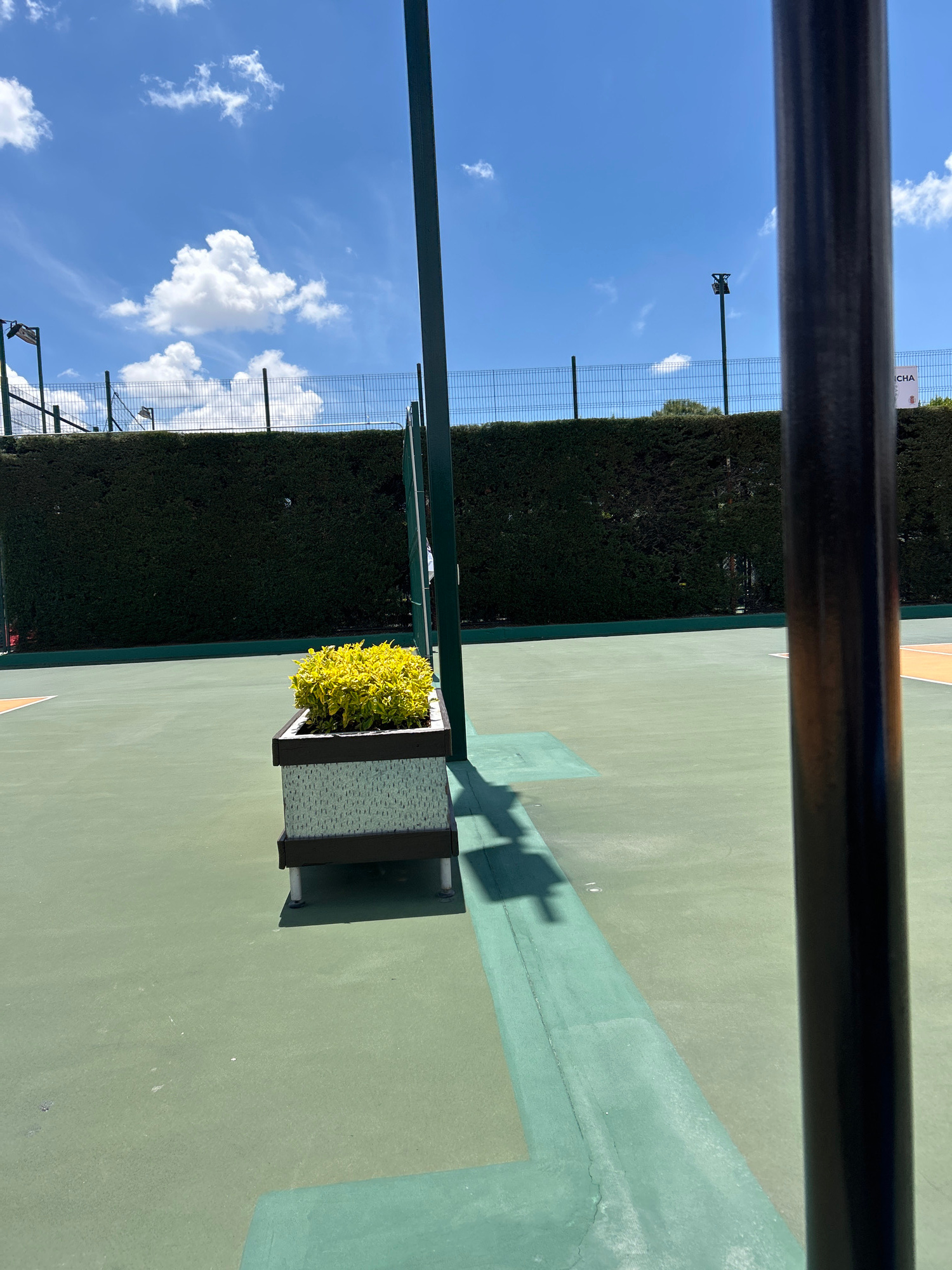 The image depicts a tennis or paddle tennis court in Puebla, Mexico, during daylight. The court surface is a light green color with darker green and orange boundary lines. A dark hedge runs along the…read more