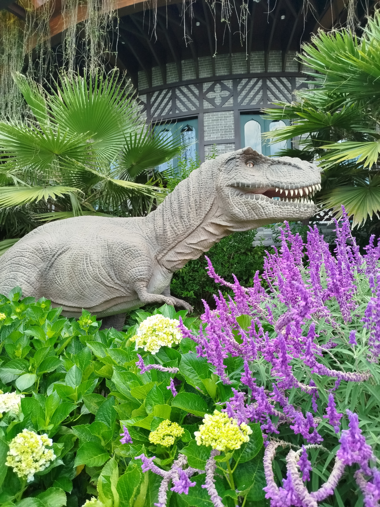 A full-length shot captures a T-rex dinosaur model in the gardens of the Fairy Garden in Cam Ly - Đà Lạt, Vietnam. The dinosaur, positioned slightly to the left of the frame, appears to be moving forw…read more