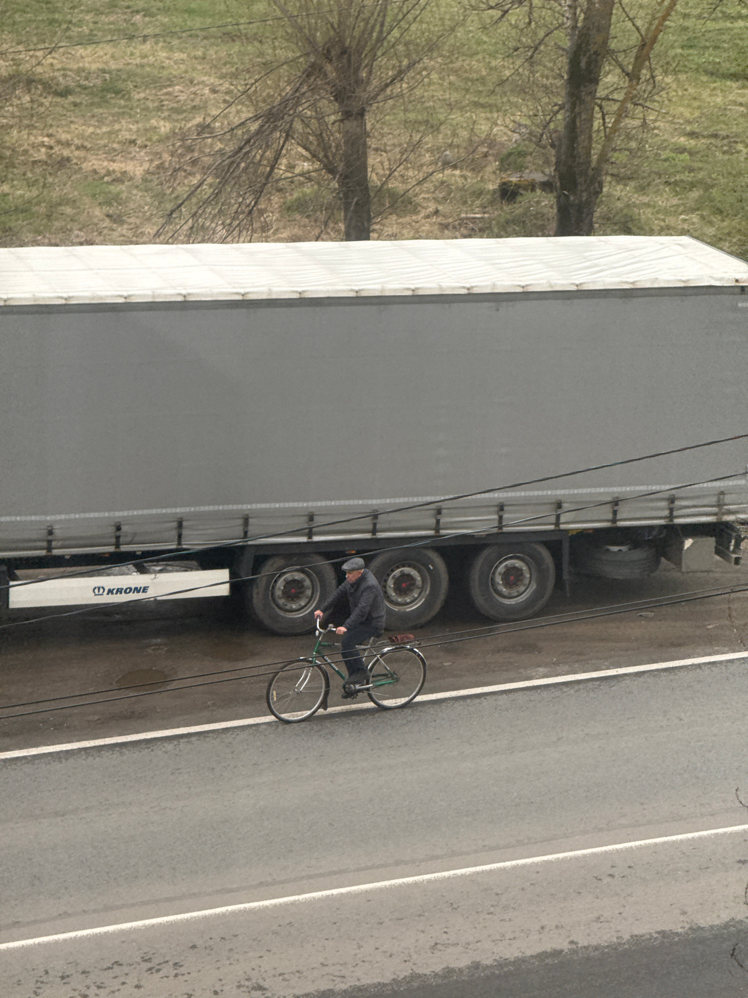This elevated view from Ново-Никольское, Russia, captures a scene of a man on a bicycle riding alongside a large semi-trailer truck on an asphalt road. The image is rotated 90 degrees, showing the roa…read more