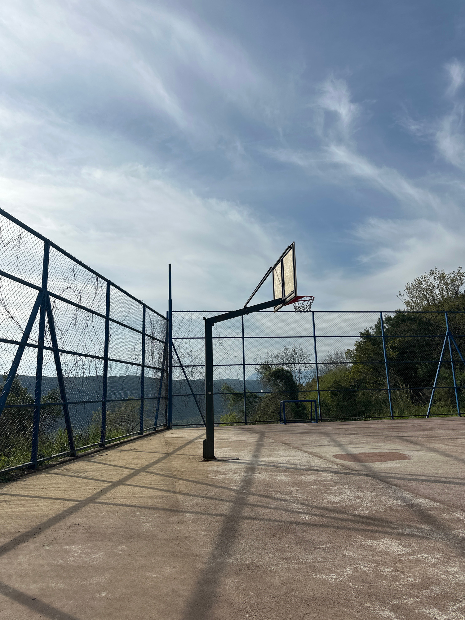The image depicts a basketball court in Seoce, Montenegro. The court surface is concrete with visible wear and tear. A basketball hoop stands with a metal backboard and a red net, positioned near a bl…read more