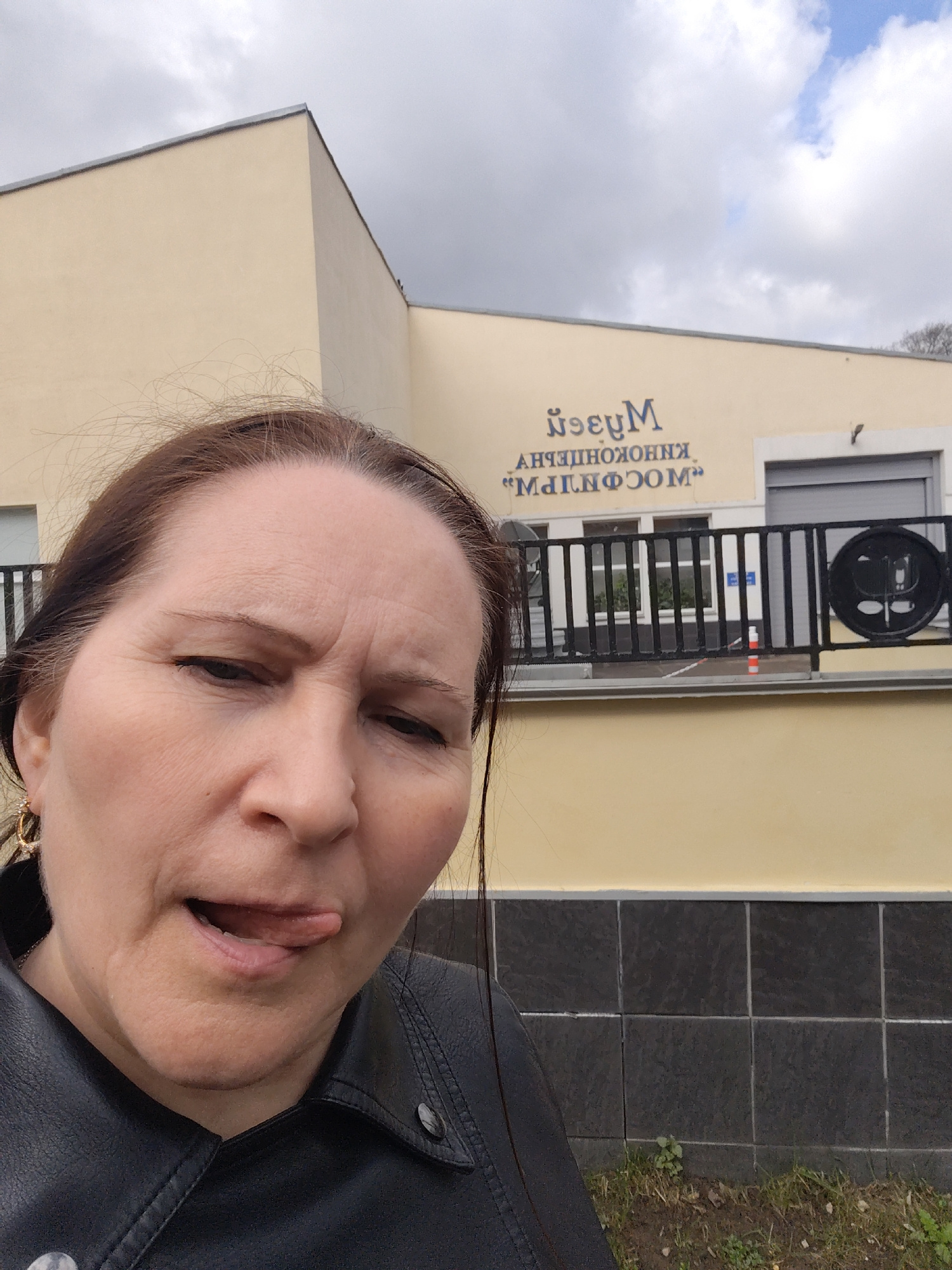 A woman takes a selfie outdoors in front of a building, captured with a playful or silly expression, her tongue slightly extended. She has dark brown hair and is wearing a black jacket, with a golden…read more