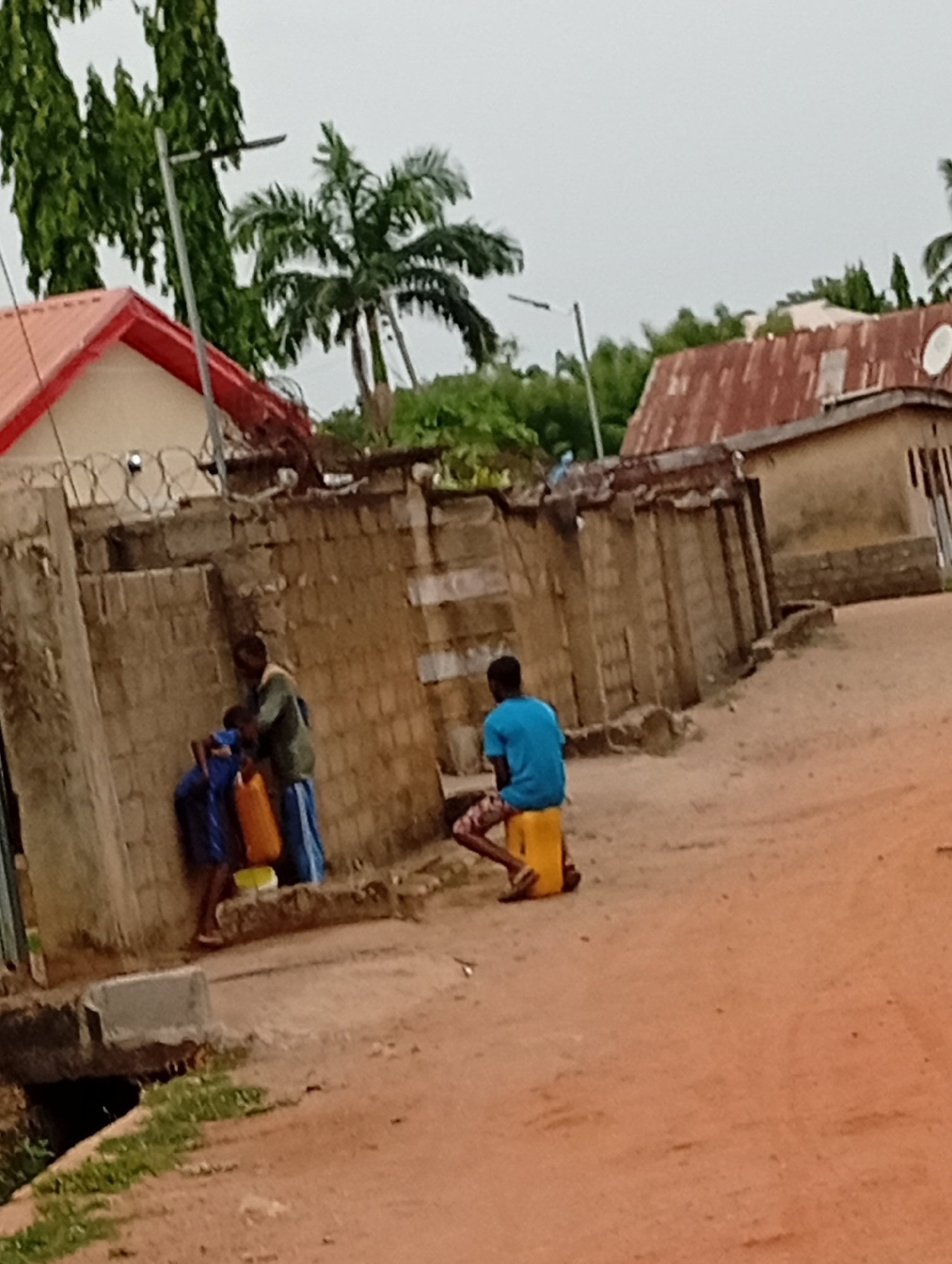 In Adankolo, Nigeria, the scene depicts a dusty, unpaved road lined with dilapidated brick walls and modest buildings. A palm tree is visible in the background. At the left, two individuals stand near…read more
