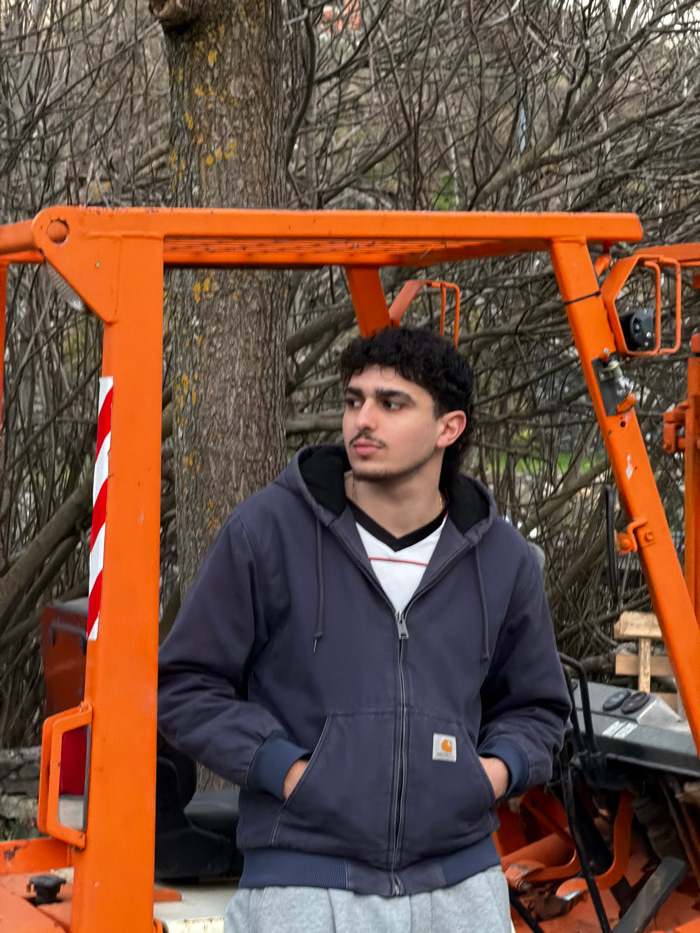 The image displays a young adult male standing outdoors in the city of Bragança, Portugal. The individual has dark, curly hair, a mustache, and a short beard. He is wearing a navy blue zippered hooded…read more