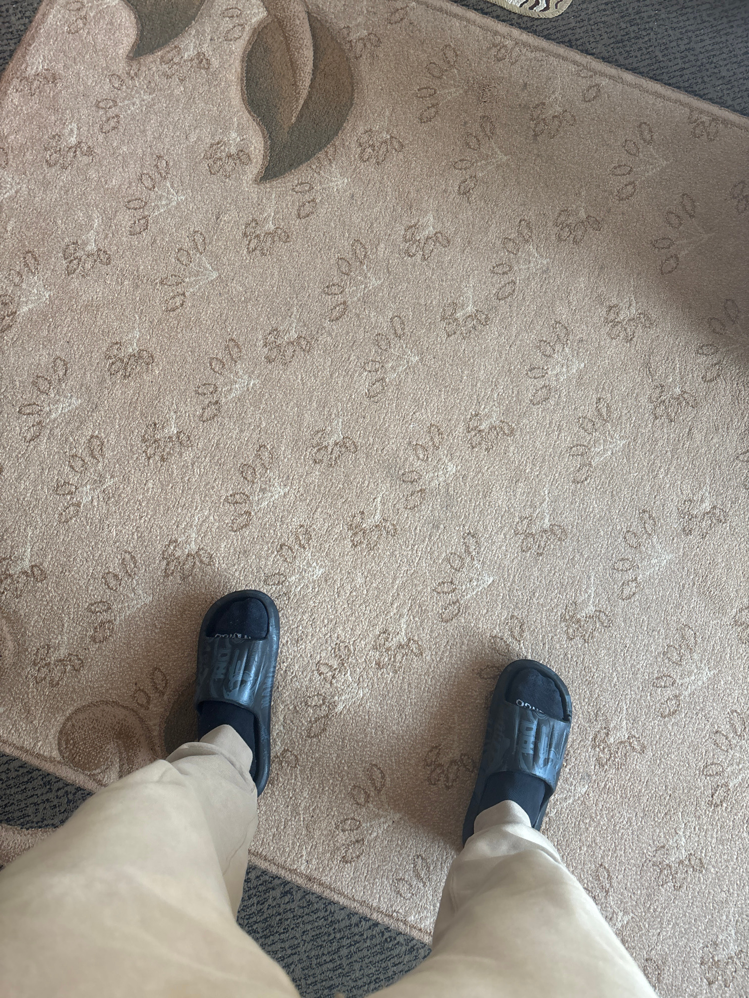 The image shows a top-down view of a beige carpet with a subtle floral pattern. In the bottom left corner, a larger floral design is visible. Two feet wearing black socks and black slide sandals are p…read more