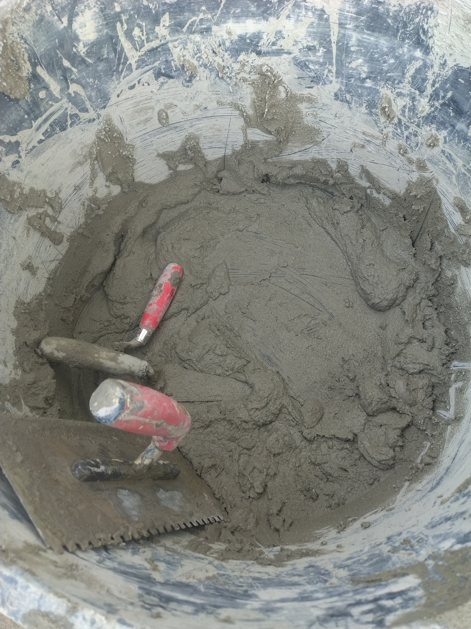 The image shows a gray plastic bucket filled with gray mortar. Two small trowels with red handles and a notched trowel lie embedded in the mortar. The inside of the bucket is coated with dried mortar.…read more