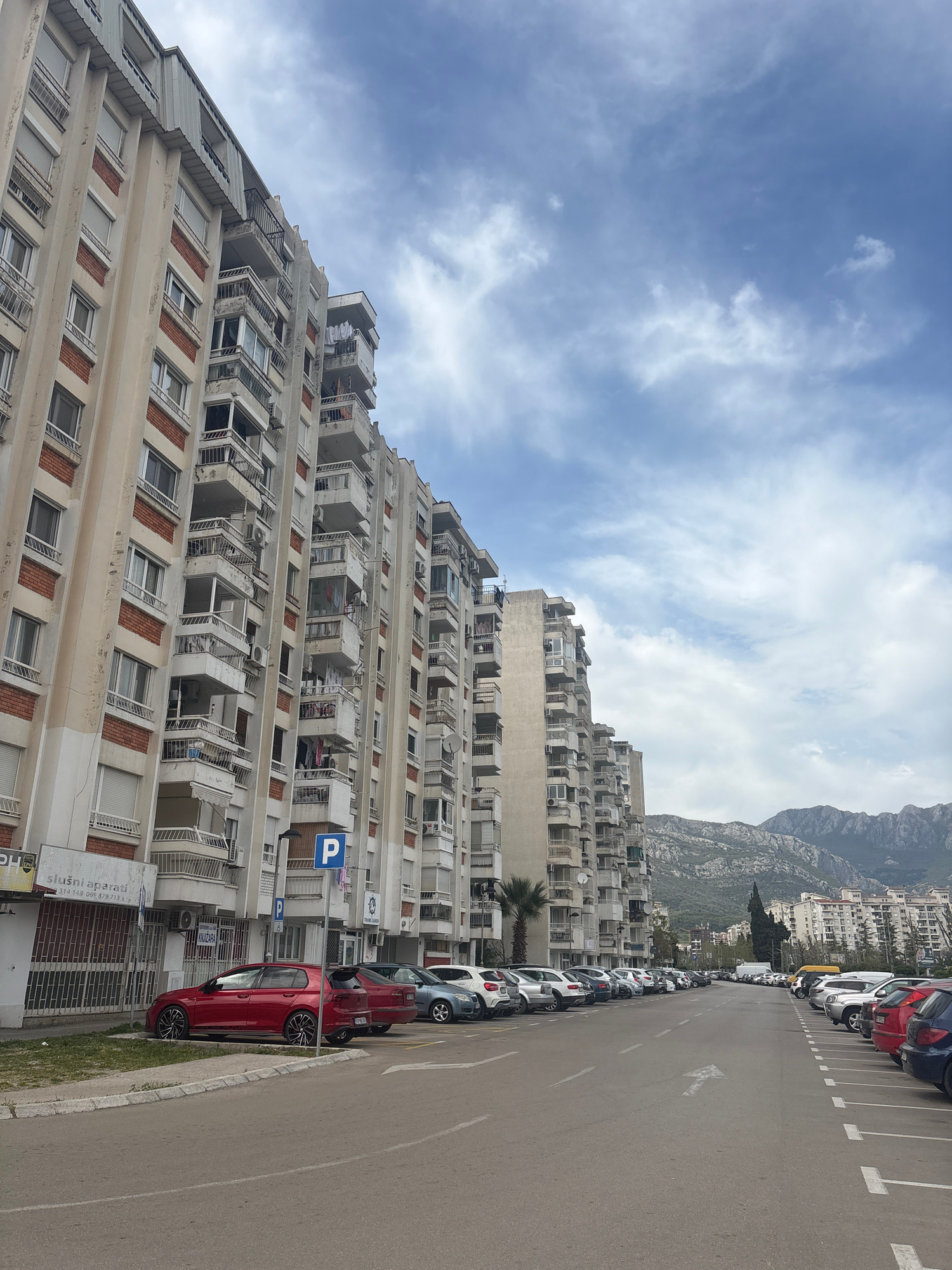 The image shows a street scene in Bar, Montenegro, dominated by a tall, aged residential building with numerous balconies. The building is off-white, with brick detailing on the lower floors. A parkin…read more