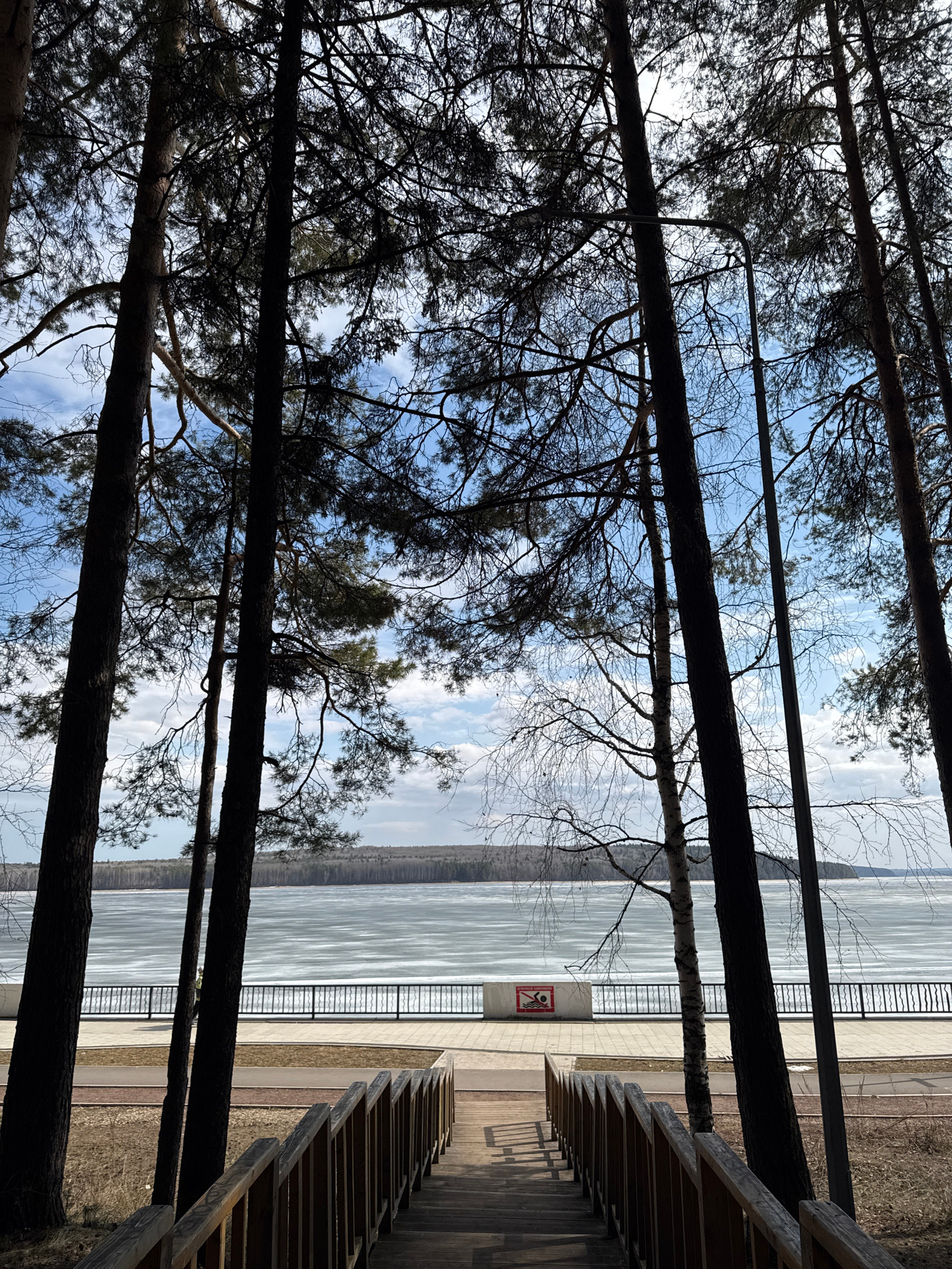 The image, rotated 90 degrees clockwise from its likely intended orientation, presents a view through a wooded area towards a body of water. In the foreground, the dark, silhouetted trunks and branch…read more