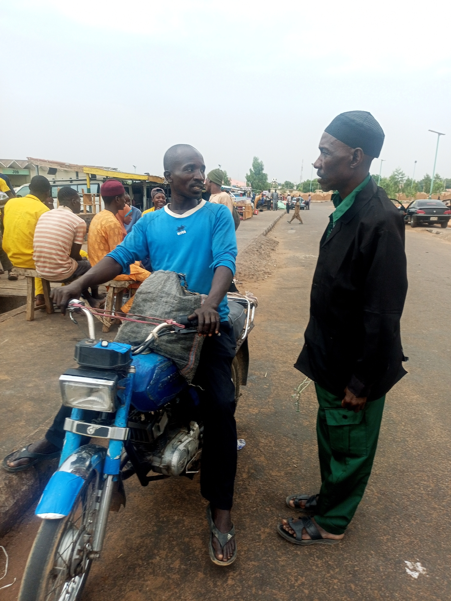The image captures a scene in Gombe, Nigeria. A man in a blue shirt is seated on a blue motorcycle. Another man, wearing a black cap, green shirt, black jacket, and green trousers, stands facing him.…read more