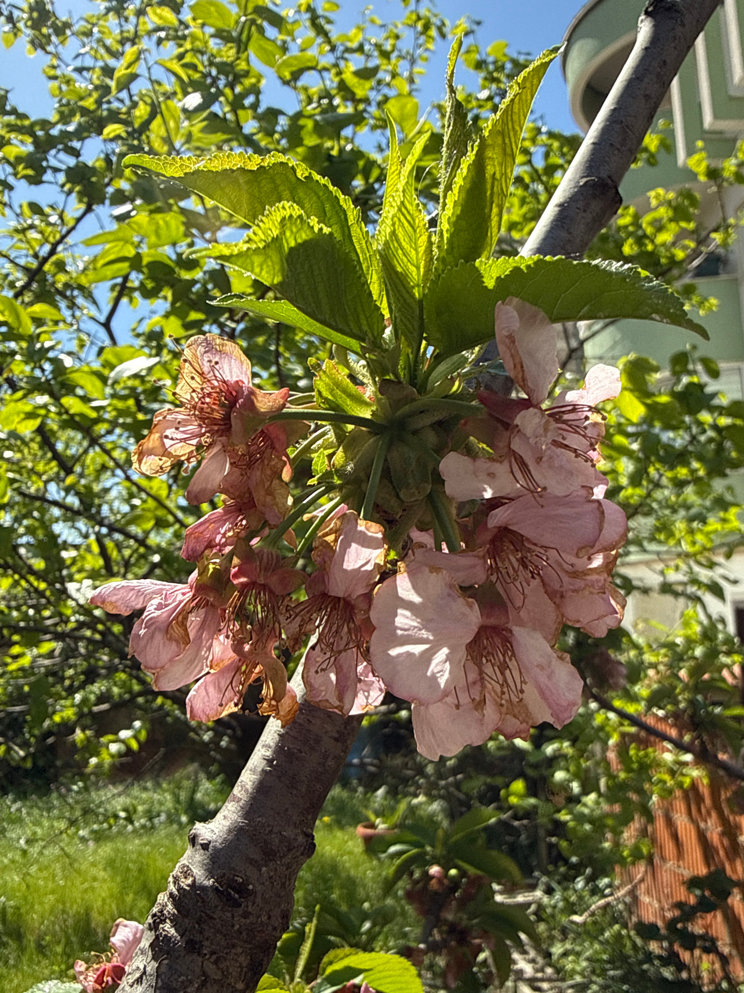 A close-up, slightly canted, outdoor shot focuses on pink blossoms and green leaves sprouting from a tree branch. The leaves are bright green, while the blossoms show signs of fading. Behind the bloss…read more