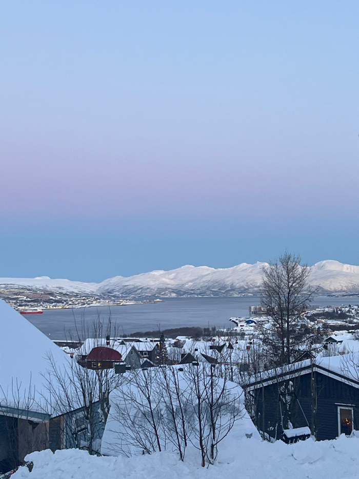 The image presents a panoramic winter landscape of Tromsø, Norway, viewed during twilight. The sky displays a gradient of color, transitioning from light blue at the zenith to a subtle purple-pink nea…read more