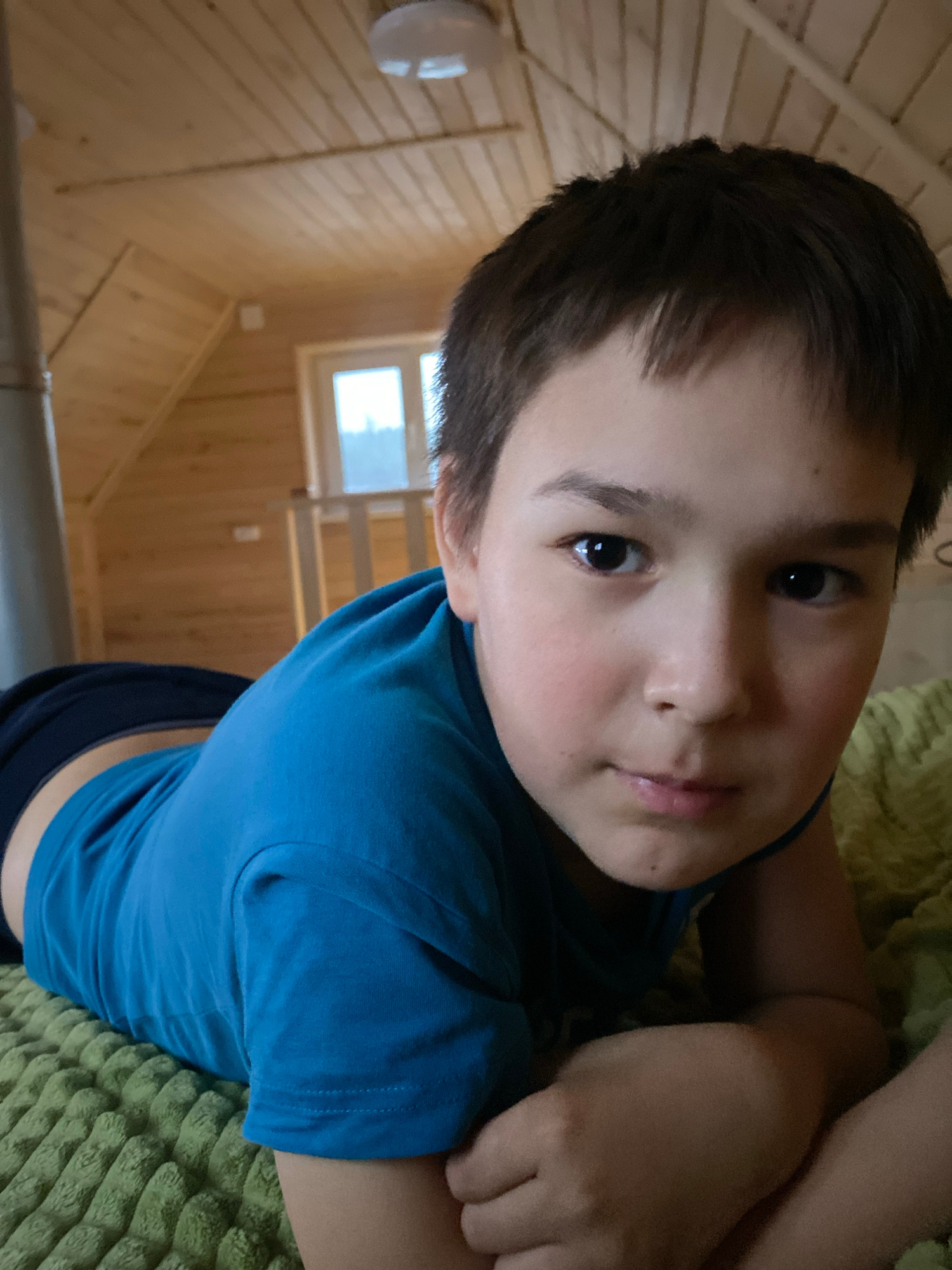 A boy lies on a green, textured surface, likely a blanket or bedspread. He is wearing a blue T-shirt and dark pants. His dark hair is short and his eyes are looking towards the camera. The background…read more