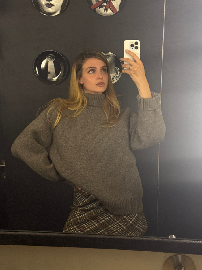 A woman with long, blonde hair wears a gray, oversized sweater and a plaid skirt. She holds a white iPhone in her right hand, taking a selfie in front of a mirror. The background includes a black wall…read more