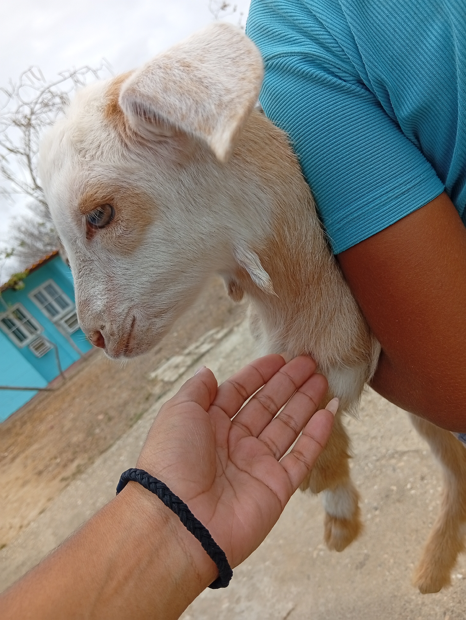 In Juan Griego, Venezuela, a person in a blue ribbed shirt holds a light beige and white kid goat close to their body. The goat's head is turned to the left, its blue eye visible. A hand with a black…read more