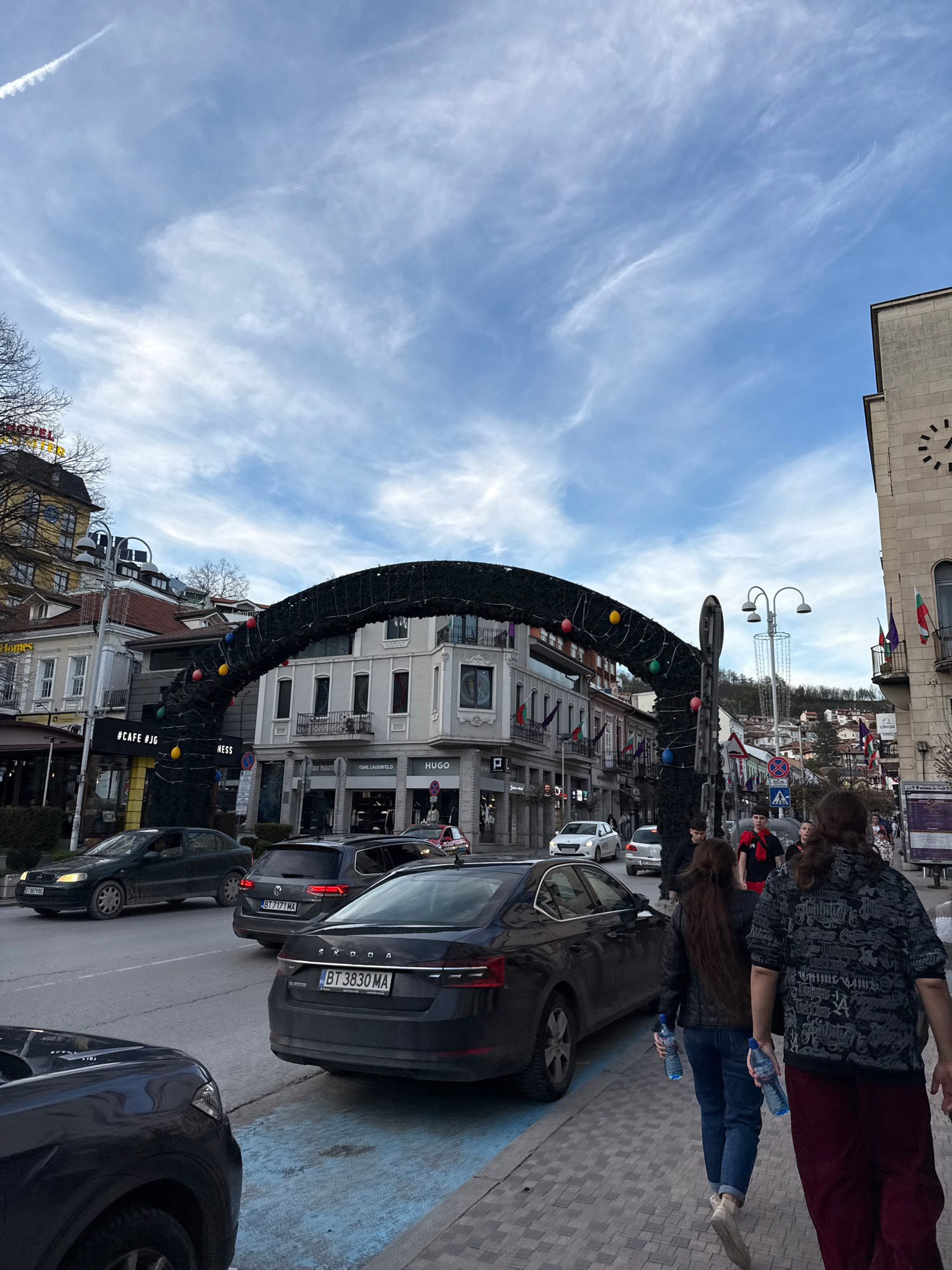 The image depicts a street scene in Veliko Tarnovo, Bulgaria. A prominent black arch, decorated with colored orbs and holiday greenery, spans the street, possibly for a seasonal event. The architectur…read more