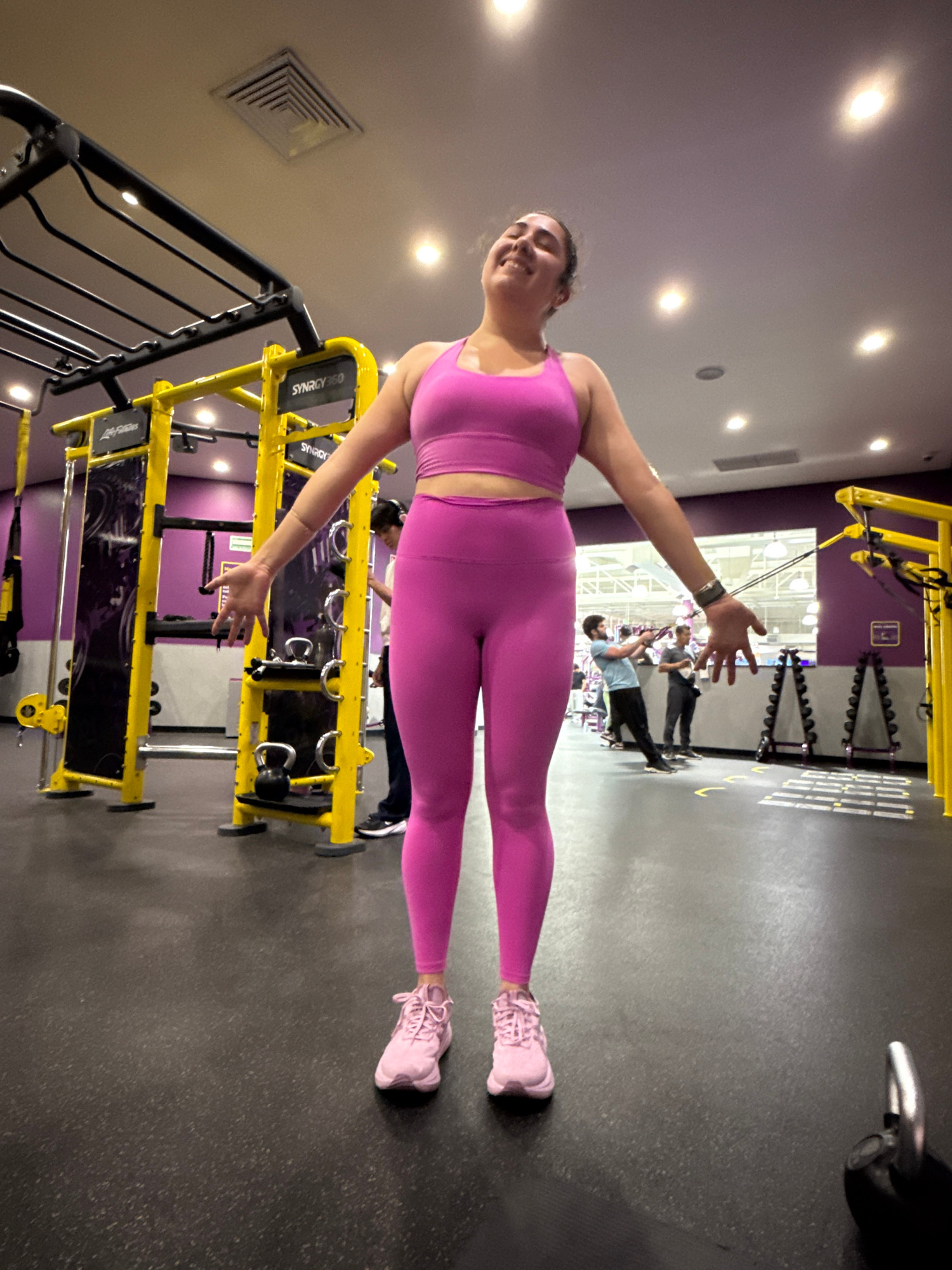 A woman in pink athletic wear (top and leggings) and pink sneakers is in a gym. She stands with arms outstretched. Other people are visible in the background. The gym equipment is predominantly yellow…read more