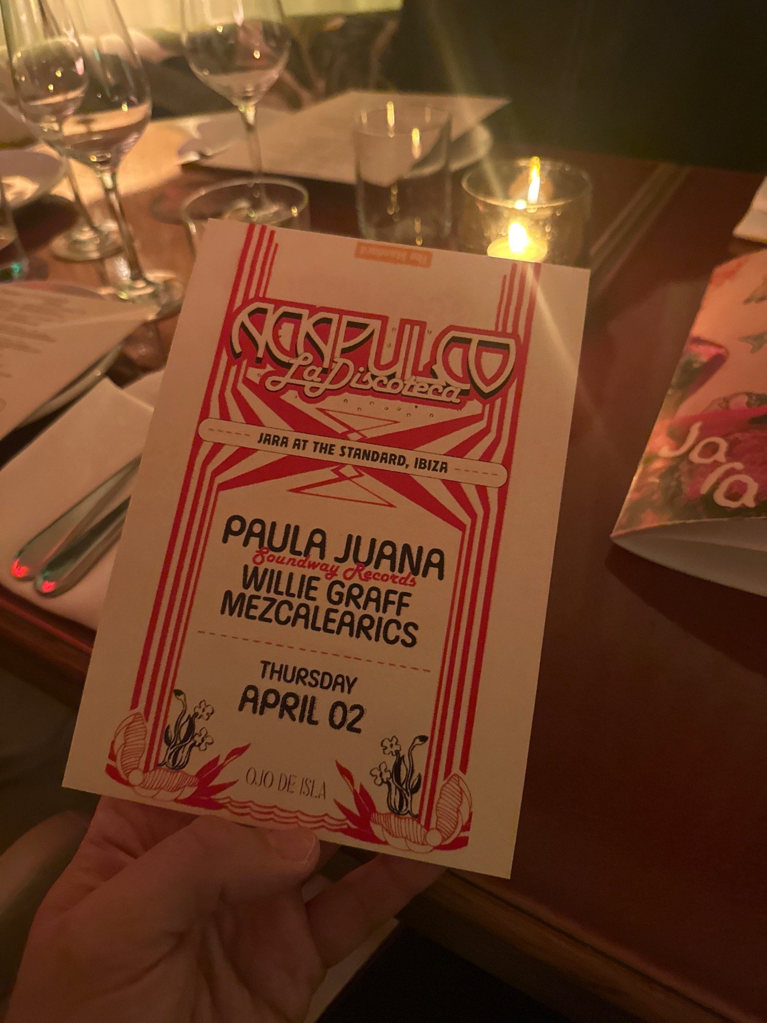 The image shows a printed event flyer for "KITULO La Discoteca" at "JARA at The Standard, Ibiza". The flyer advertises a Thursday, April 02 event featuring Paula Juana (Soundway Records), Willie Graff…read more