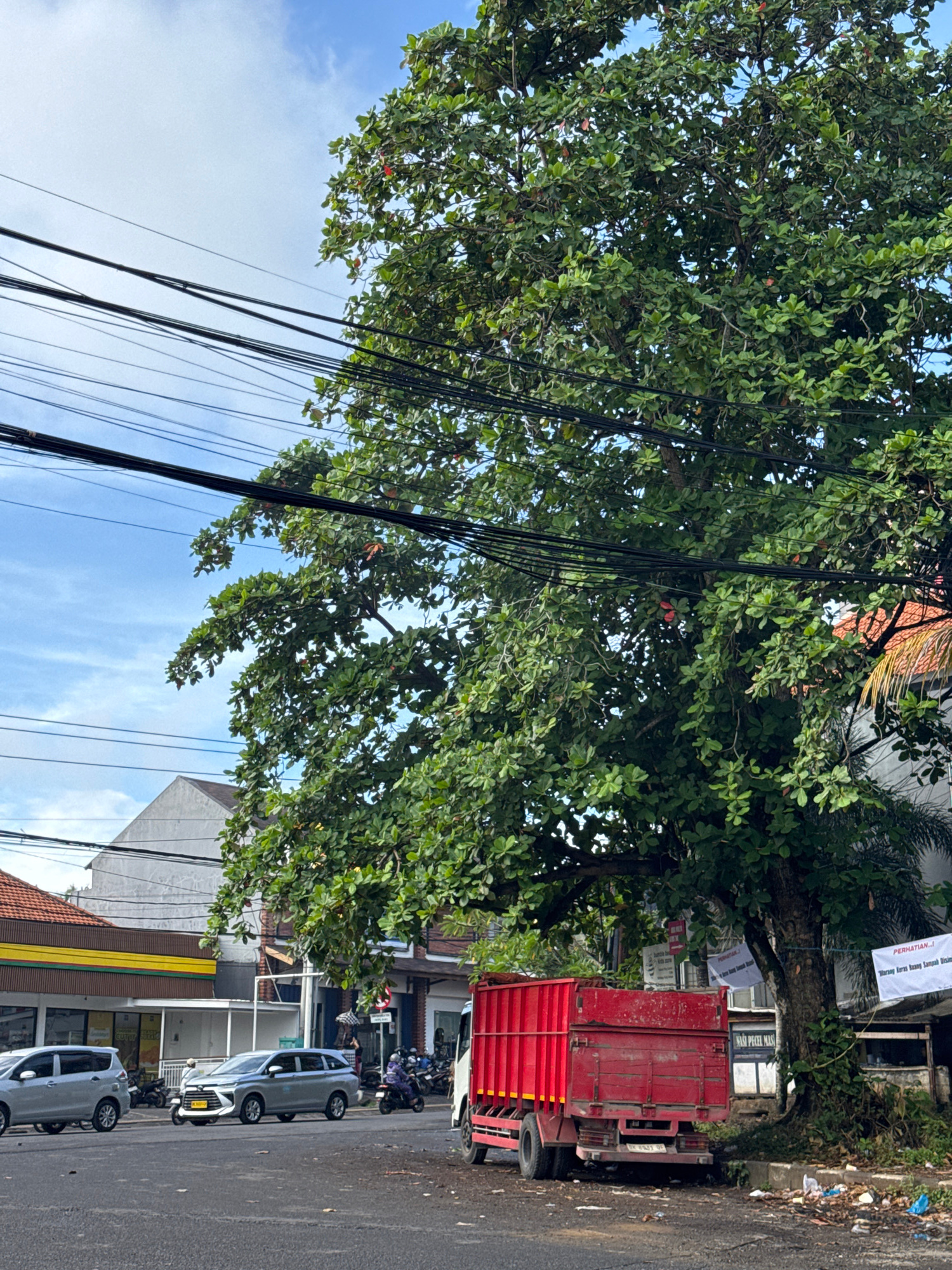 The image captures a vibrant daytime street scene in Kuta Selatan, Indonesia, under a bright blue sky dotted with scattered white clouds. A prominent feature is a large, leafy tree with dense green fo…read more