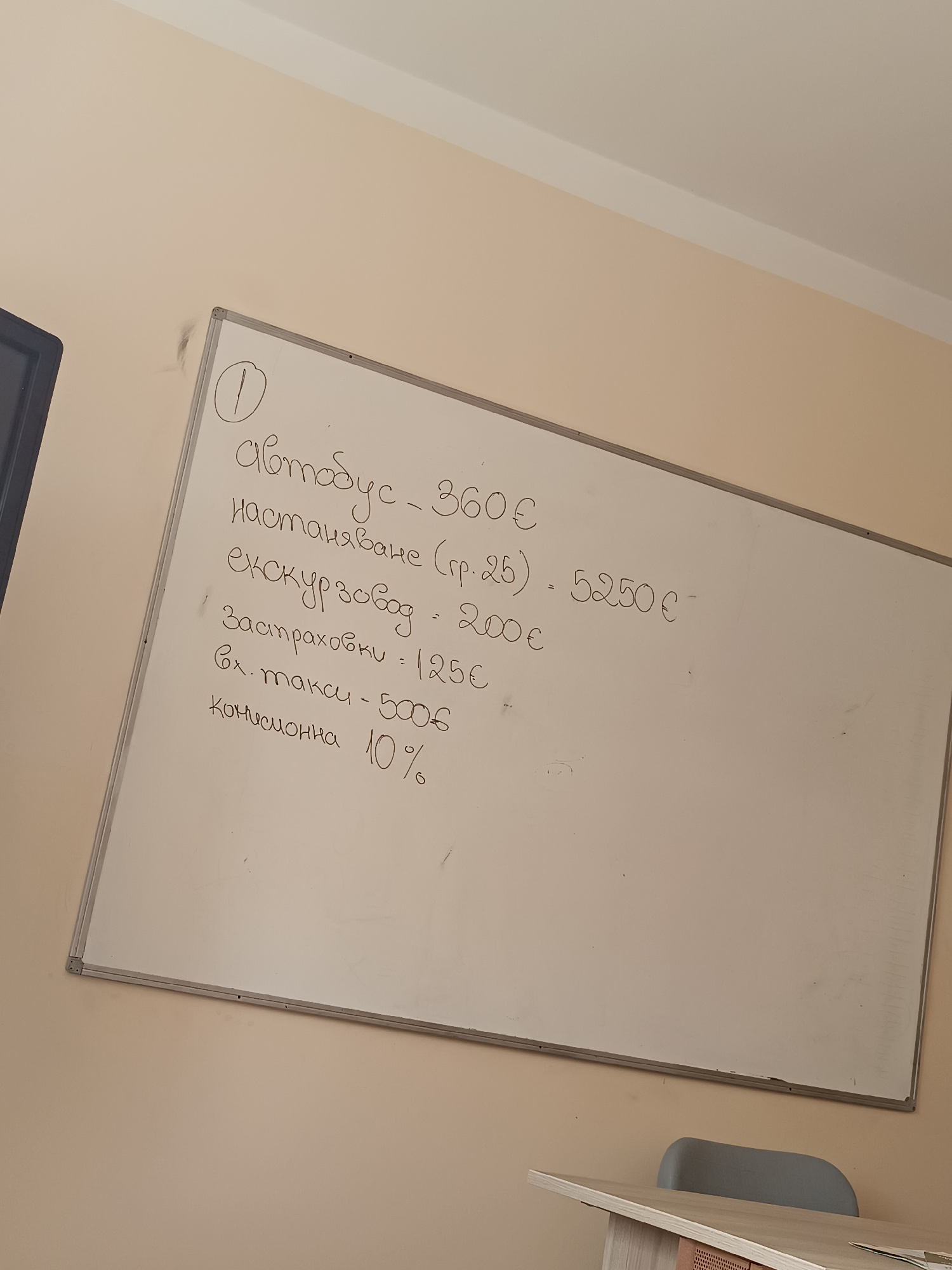 Here is a description of the image: The image shows a whiteboard mounted on a light beige wall. On the whiteboard, written in dark marker, is a list of expenses labeled with a numeral "1" at the top…read more