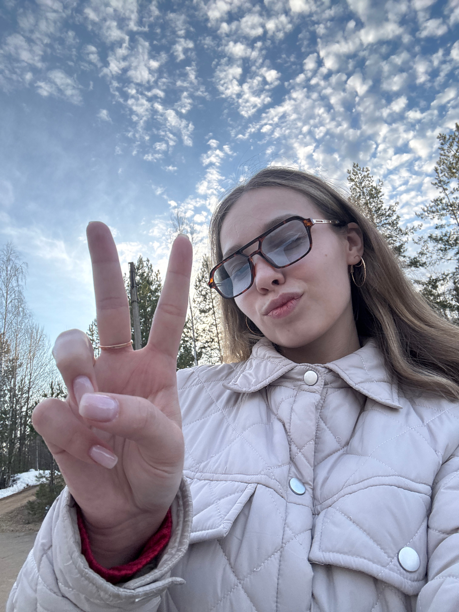 A young woman is taking a selfie outdoors. She wears a quilted jacket, eyeglasses, and hoop earrings. She is making a peace sign with her fingers. The background includes a blue sky with clouds and tr…read more