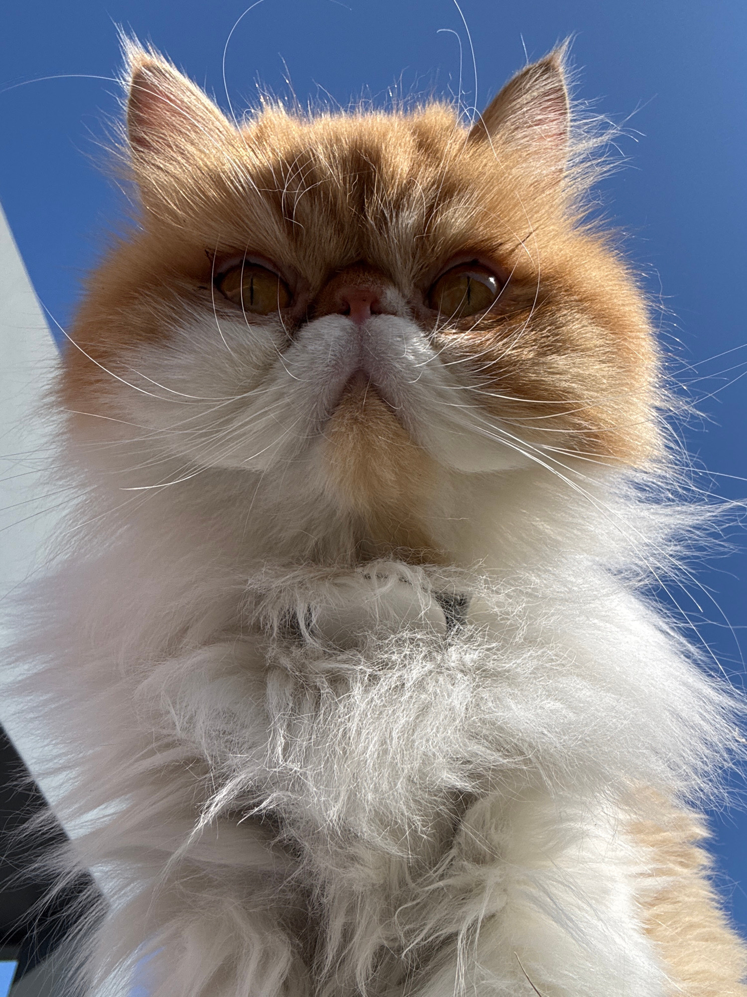 An extreme close-up, upward-angle shot focuses on a fluffy, ginger and white Persian cat. The cat is positioned in the upper half of the frame, with its head tilted slightly to the left. Its face is i…read more