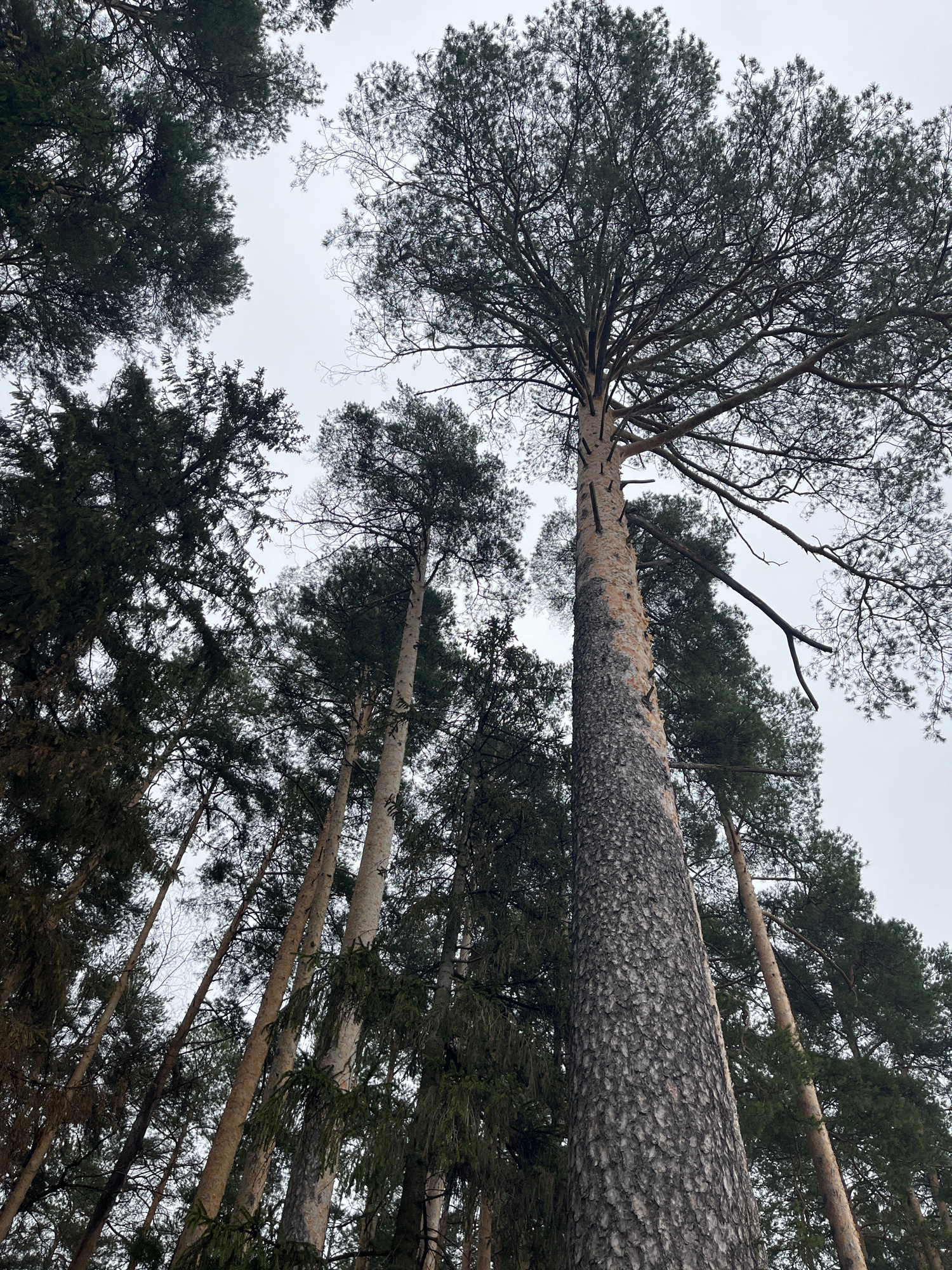 The image depicts a view looking upward into a forest canopy, with tall, coniferous trees dominating the scene. The sky is overcast, casting a diffuse light. One large tree appears to have fallen, resβ¦read more