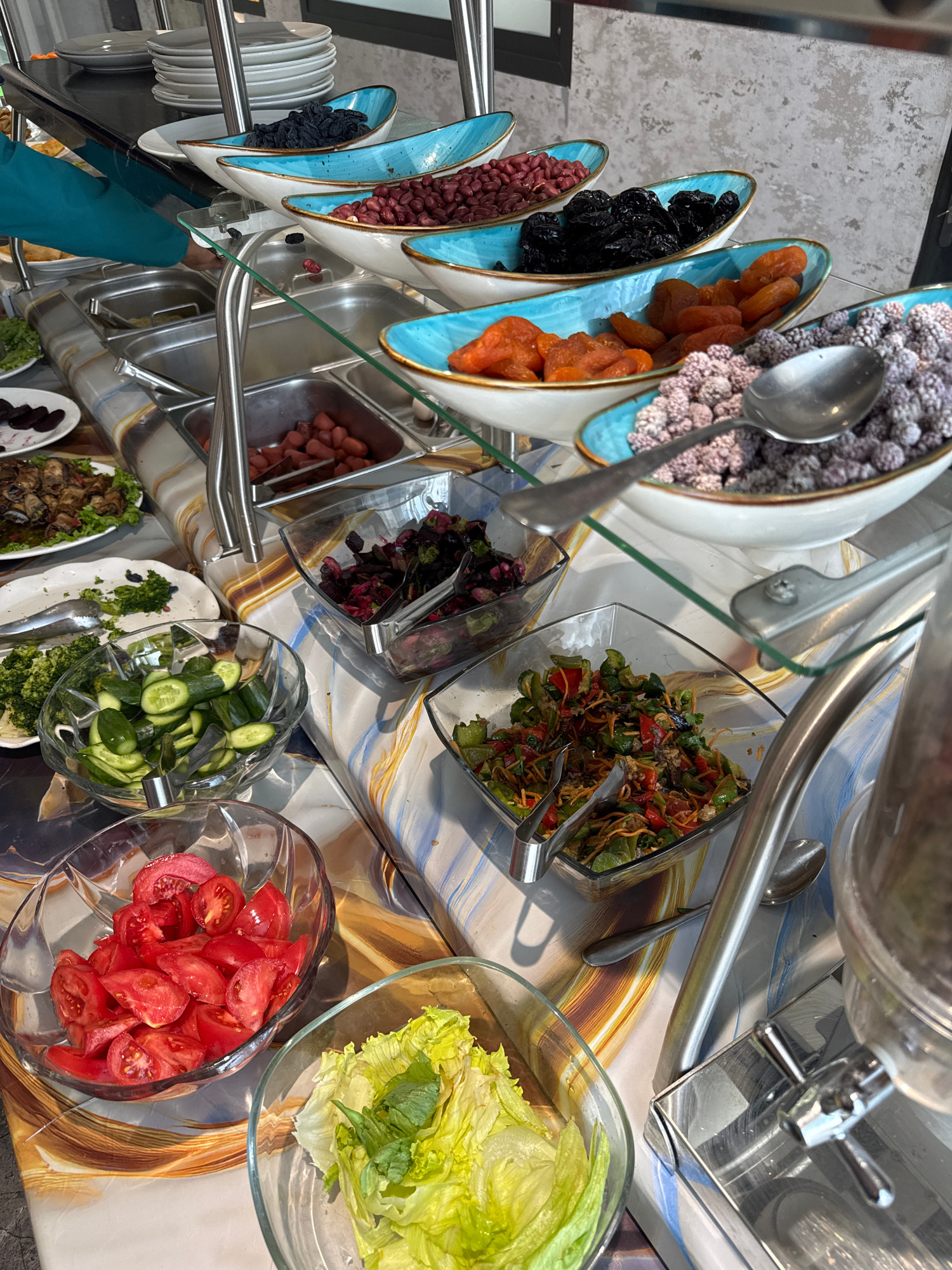 The image presents a buffet-style food arrangement, likely within a dining facility. A variety of food items are displayed in bowls and serving dishes including dried fruits, various salads, sliced cu…read more