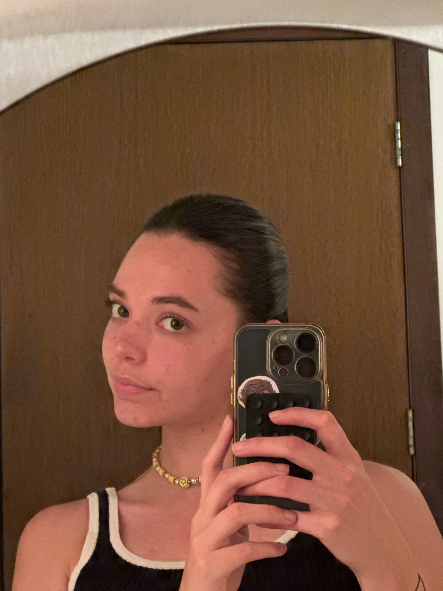 A person is taking a selfie in a mirror. The person is holding a smartphone with a dark case. The phone has multiple camera lenses visible. The person is wearing a black and white top. The background…read more