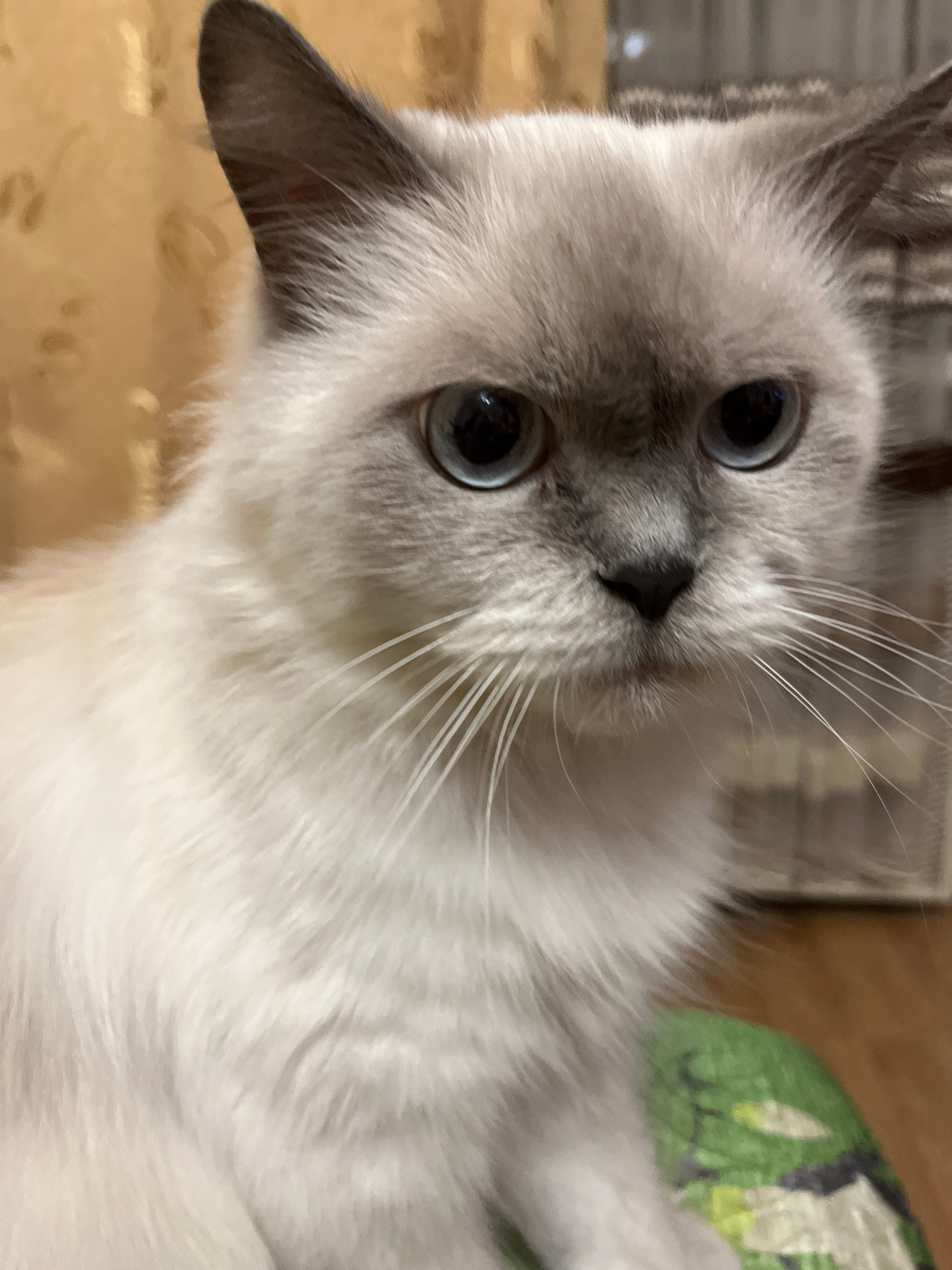 A close-up shot of a light-colored cat's face. The cat has striking blue eyes and white fur with darker points on its ears and nose. The background is slightly blurred and shows glimpses of a patterne…read more
