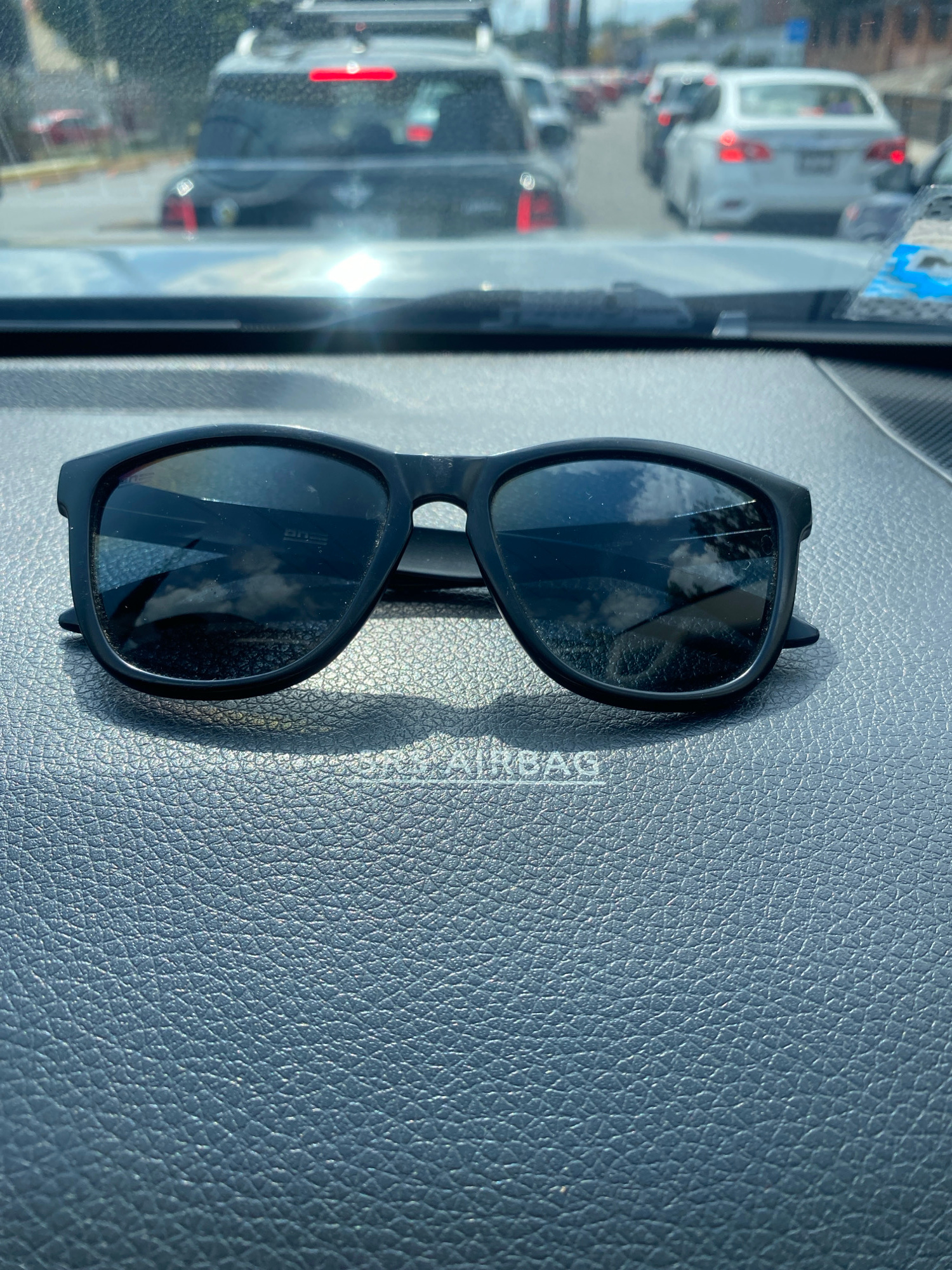 A pair of black sunglasses rests on a dark, textured car dashboard, which appears to be made of synthetic leather or plastic. The word "AIRBAG" is visibly embossed on the dashboard. Strong sunlight il…read more