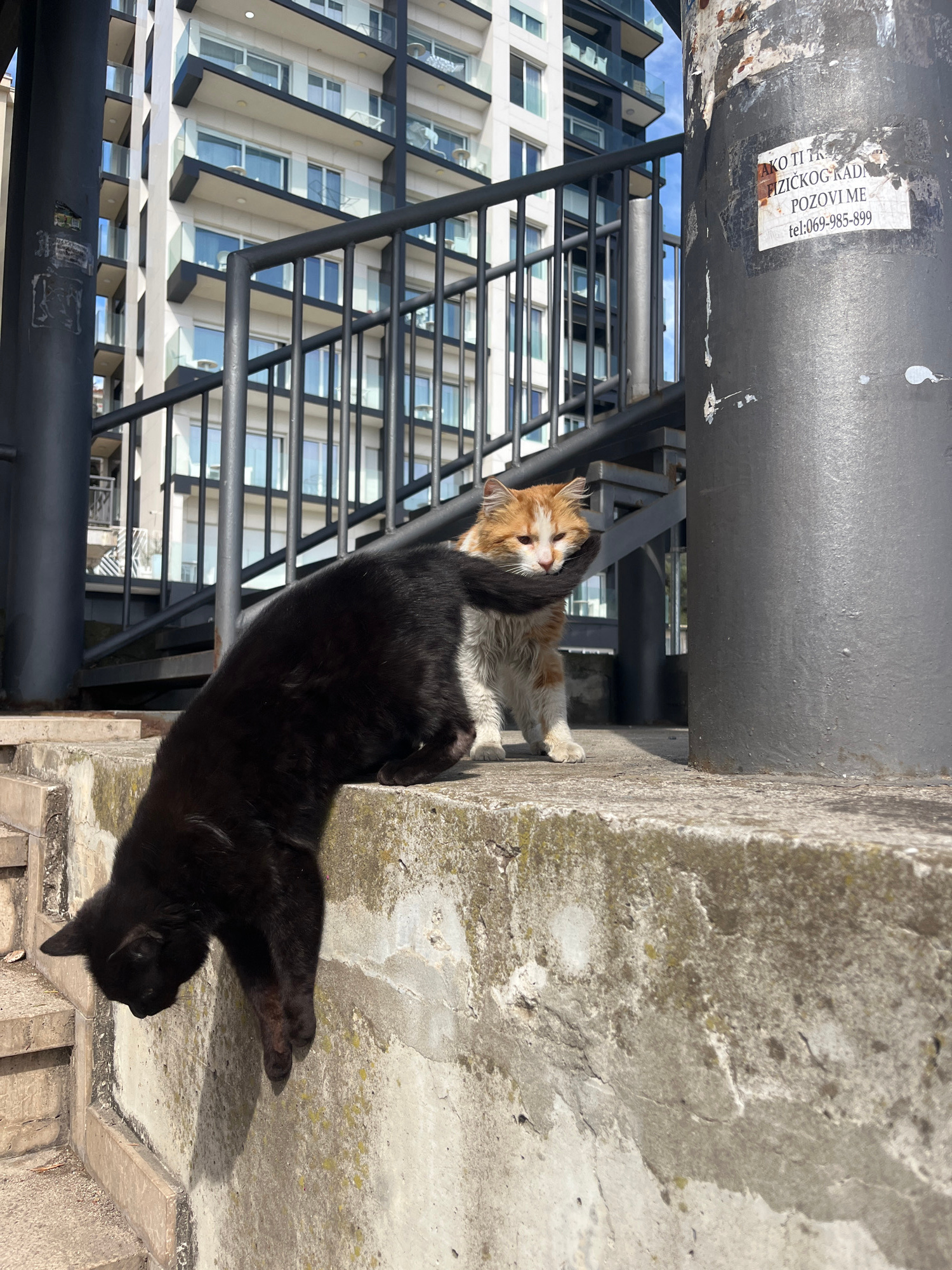 Two cats are on a concrete ledge next to a metal structure, possibly a fire escape. One cat is black, lying down, and the other is orange and white, sitting up. A building with a modern architectural…read more
