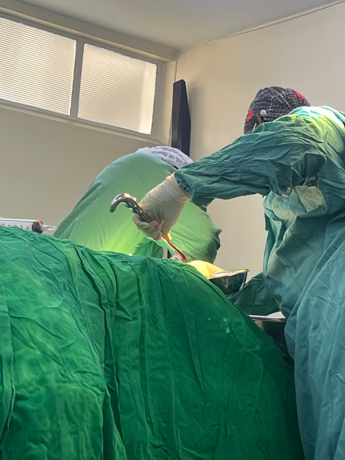 The image depicts an interior view of a medical operating room in a facility within Nairobi, Kenya. Two individuals are present, both attired in green surgical scrubs. The foreground individual wears…read more