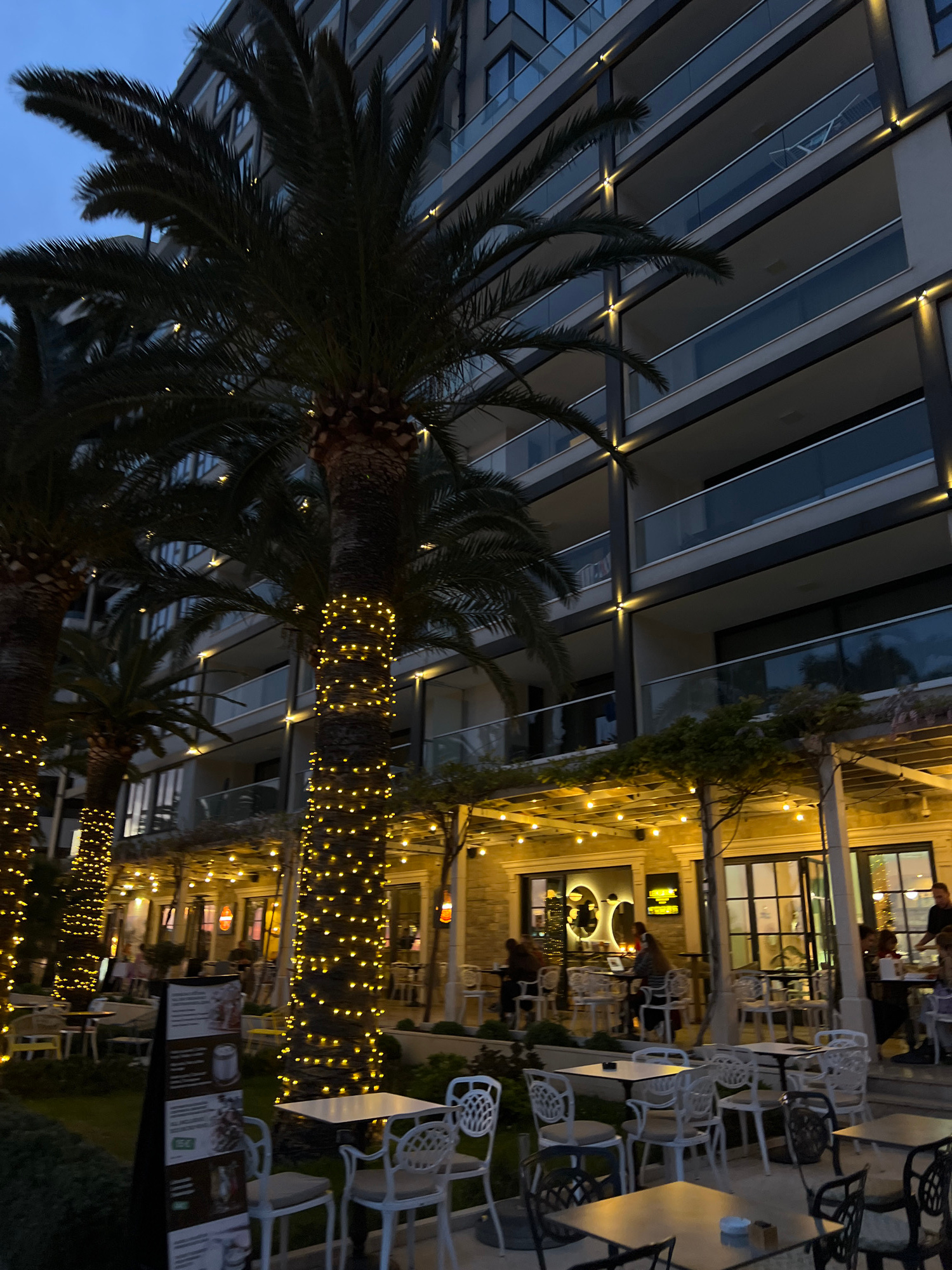 The image shows an outdoor dining area in Rafailovići, Montenegro at night. The dining area is illuminated by strings of lights that are wrapped around palm trees. Tables and chairs are set up for pat…read more