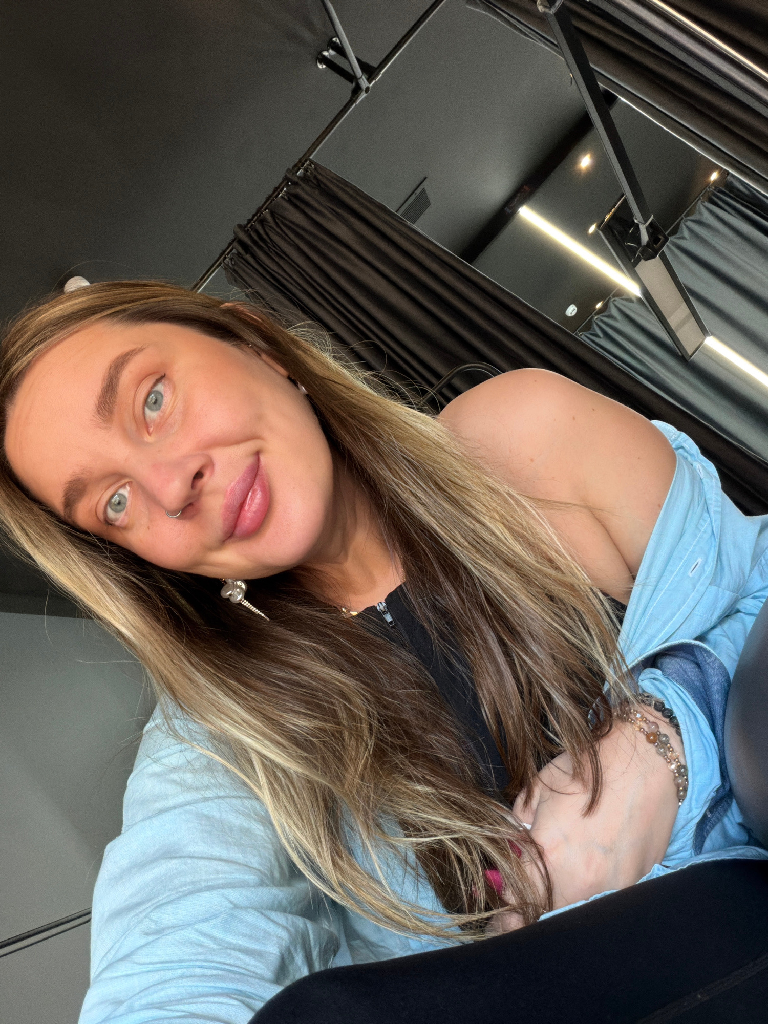 A woman with long blonde hair and light blue eyes is wearing a light blue shirt and black leggings. She has a nose ring and dangling earrings. The background appears to be a dressing room or fitting r…read more