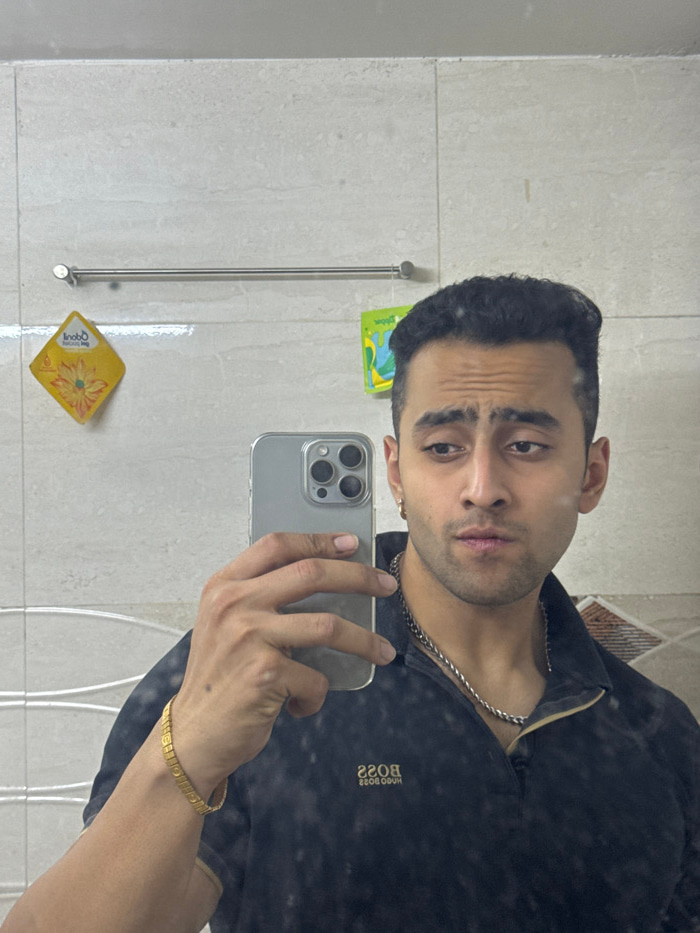 A male individual is captured in a mirror selfie in an indoor setting, identified as Kolkata, India. He is depicted from the chest up, with dark, styled hair, a slight stubble, and wearing a dark coll…read more