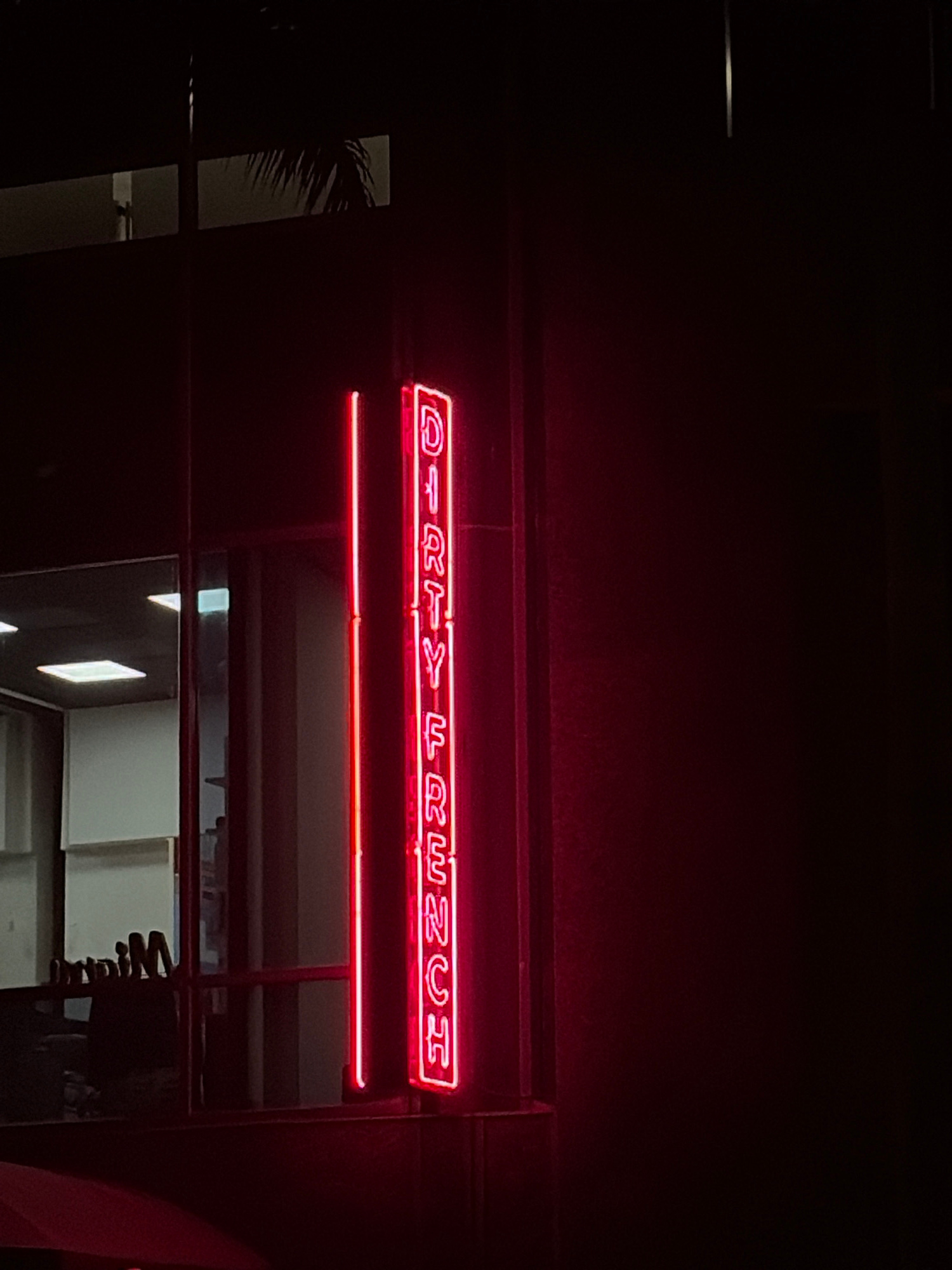 The image shows a neon sign reading "DIRTY FRENCH" in red, possibly the entrance to a restaurant. The location appears to be in an urban setting, possibly in Miami, Florida, judging by the architectur…read more