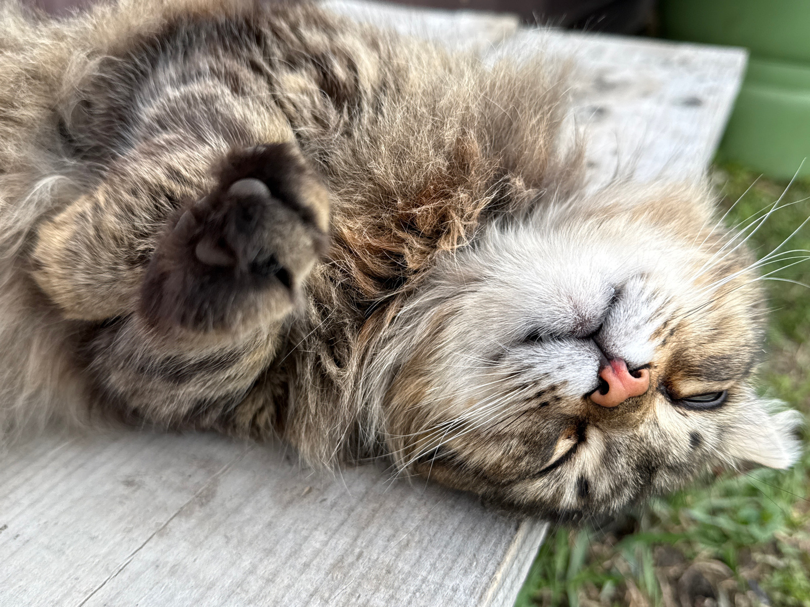A medium-shot image captures a fluffy cat lying on a weathered wooden surface. The cat is a mix of brown and grey, with a pink nose and closed eyes. Its paws are curled up near its face. Patches of gr…read more