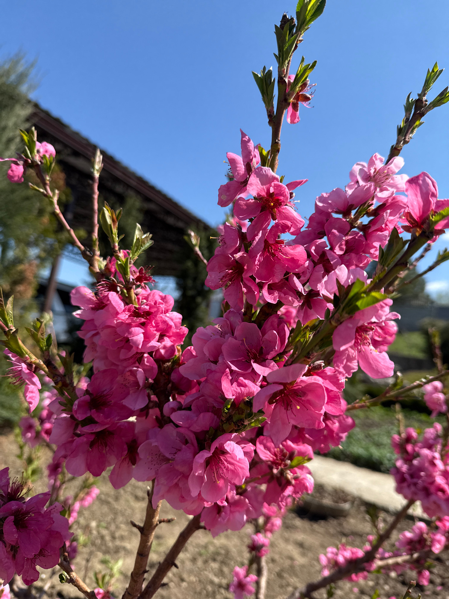 A close-up, angled view showcases a blossoming peach tree branch laden with vibrant pink flowers. The branch extends from the lower right towards the upper left of the frame. New, green leaves are int…read more